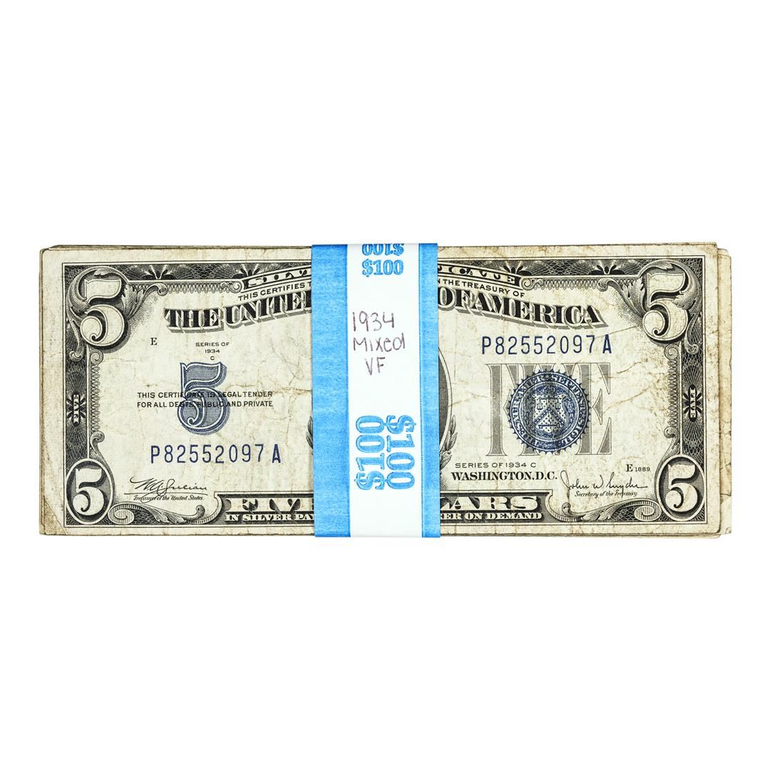 Lot of (20) Mixed Series 1934 $5 Silver Certificate Notes - Very Fine