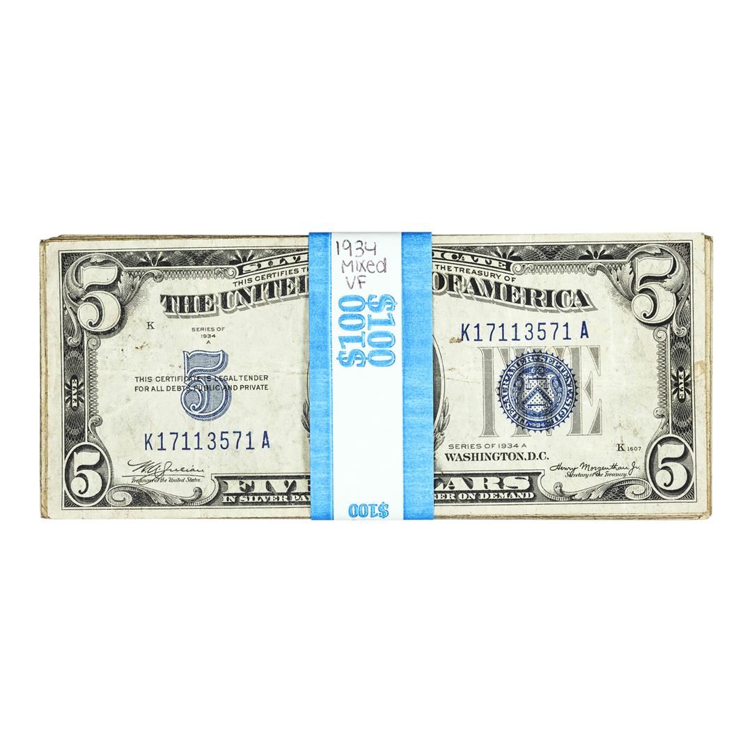 One Lot of (20) Mixed Series 1934 $5 Silver Certificate Notes - Very Fine.