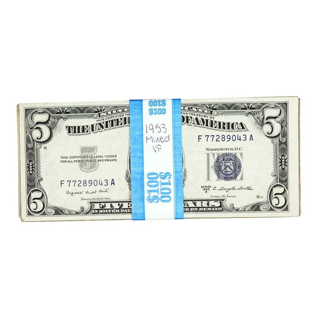 One Lot of (20) Mixed Series 1953 $5 Silver Certificate Notes - Very Fine.