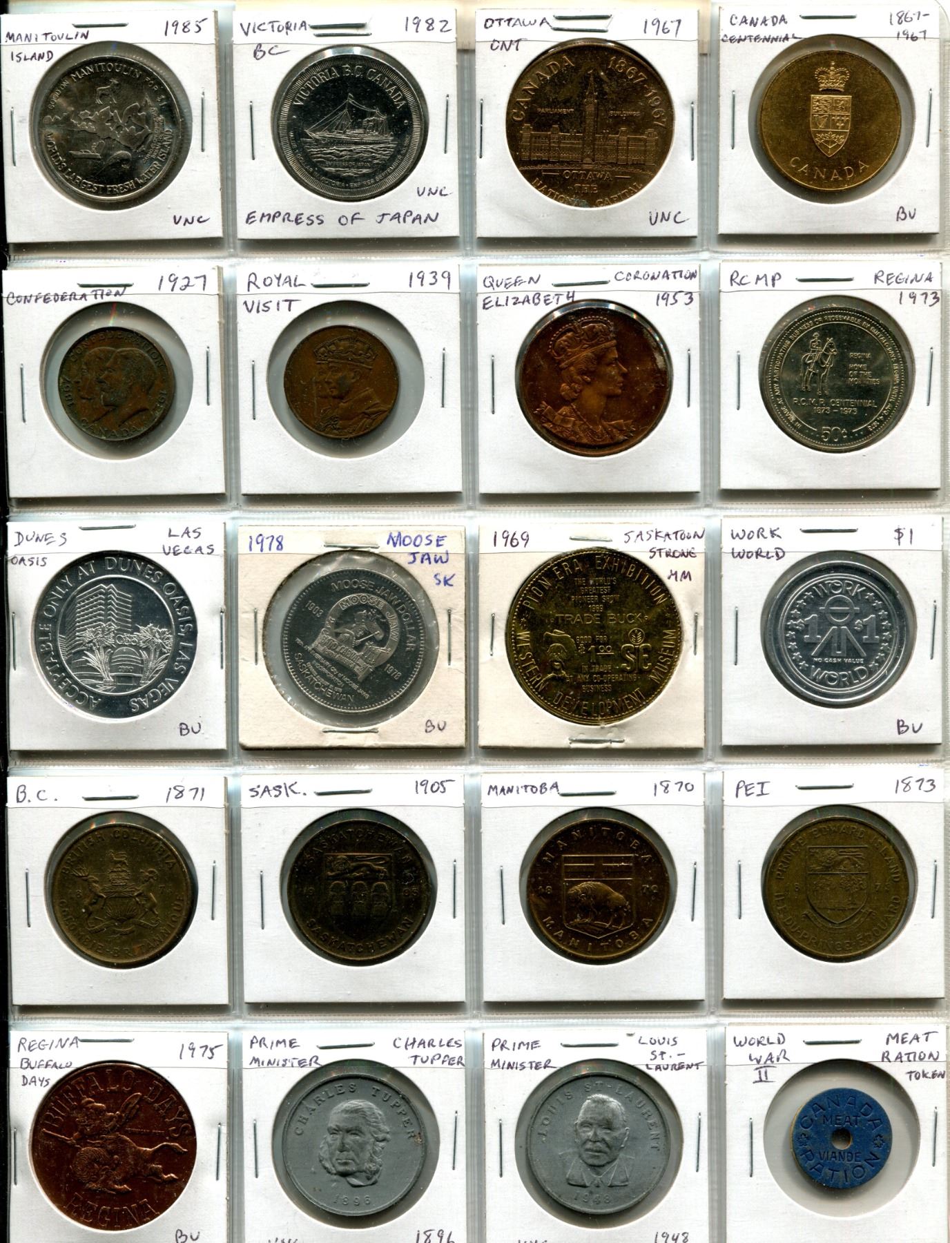 Lot of 20 Trade Dollars, Tokens and Medals. Includes Manitoulin Island, Victoria, Ottawa Centennial, Confederation, Royal Visit, Coronation, RCMP, Casino, Provincial, Prime Ministers and Meat Ration Token. A nice selection.
