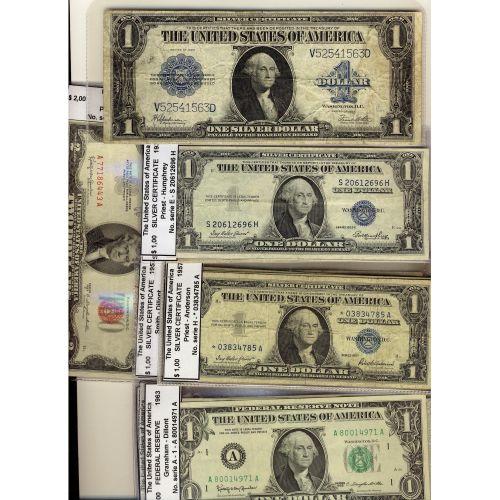 Lot of 20 US banknotes. Includes 1923 $1 #V52541563 (Fine), 1935 $1 (4) F to EF, 1957 $1 (3) F to VF, 1963 $1 (3) EF-AU, 1969 $1 (5) EF to AU, 1974 $1 (1) EF, 1988 $1 (1) EF and 1953 $2 (2) Fine.