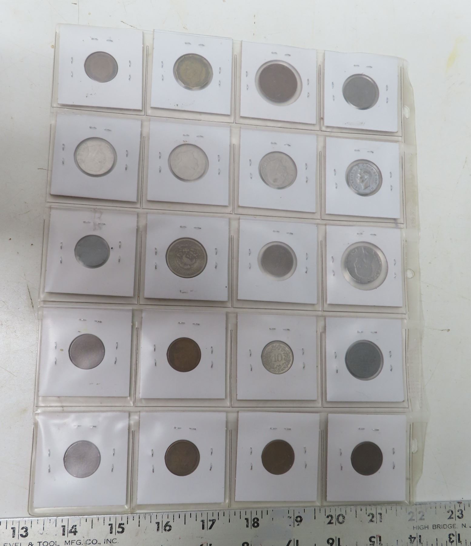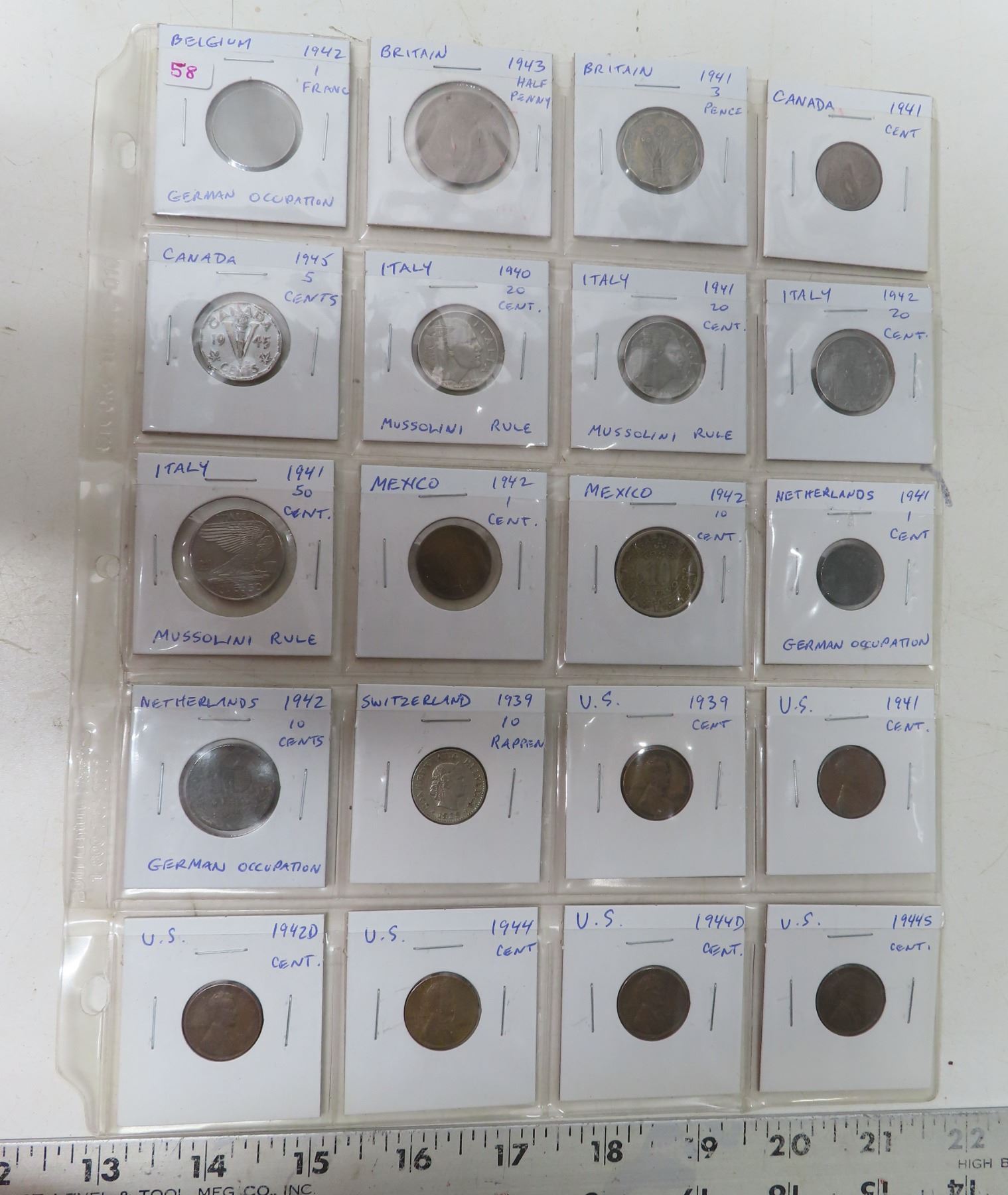 Lot of 20 World War II Coins. Includes Belgium under Germany occupation, Great Britain, Canada, Italy under Mussolini rule, Mexico, Netherlands under German occupation, Switzerland, & the U.S.