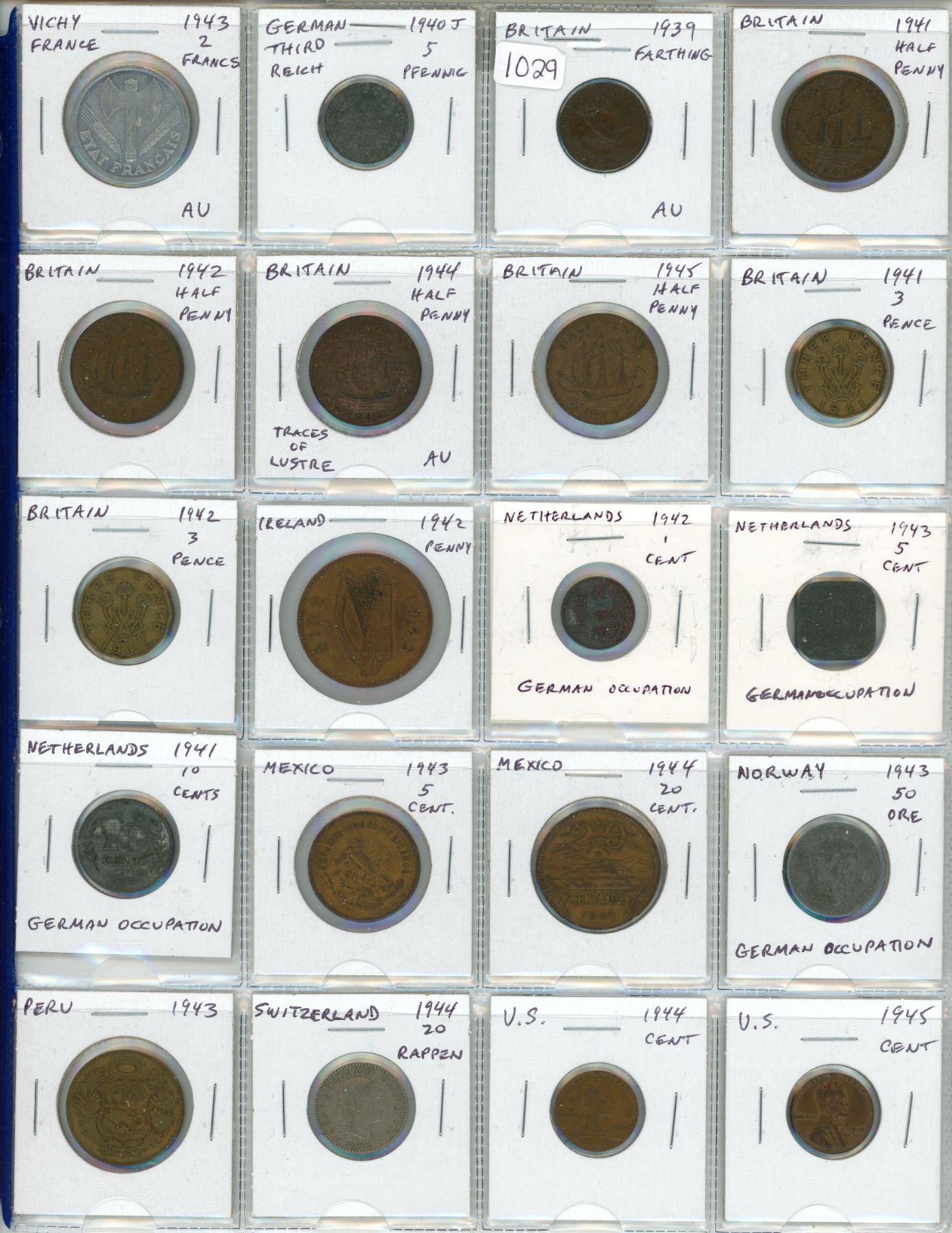 Lot of 20 World War II Coins. Includes Vichy France, German Third Reich, Great Britain, Ireland, Netherlands under German occupation, Mexico, Norway under German occupation, Peru, Switzerland & USA.
