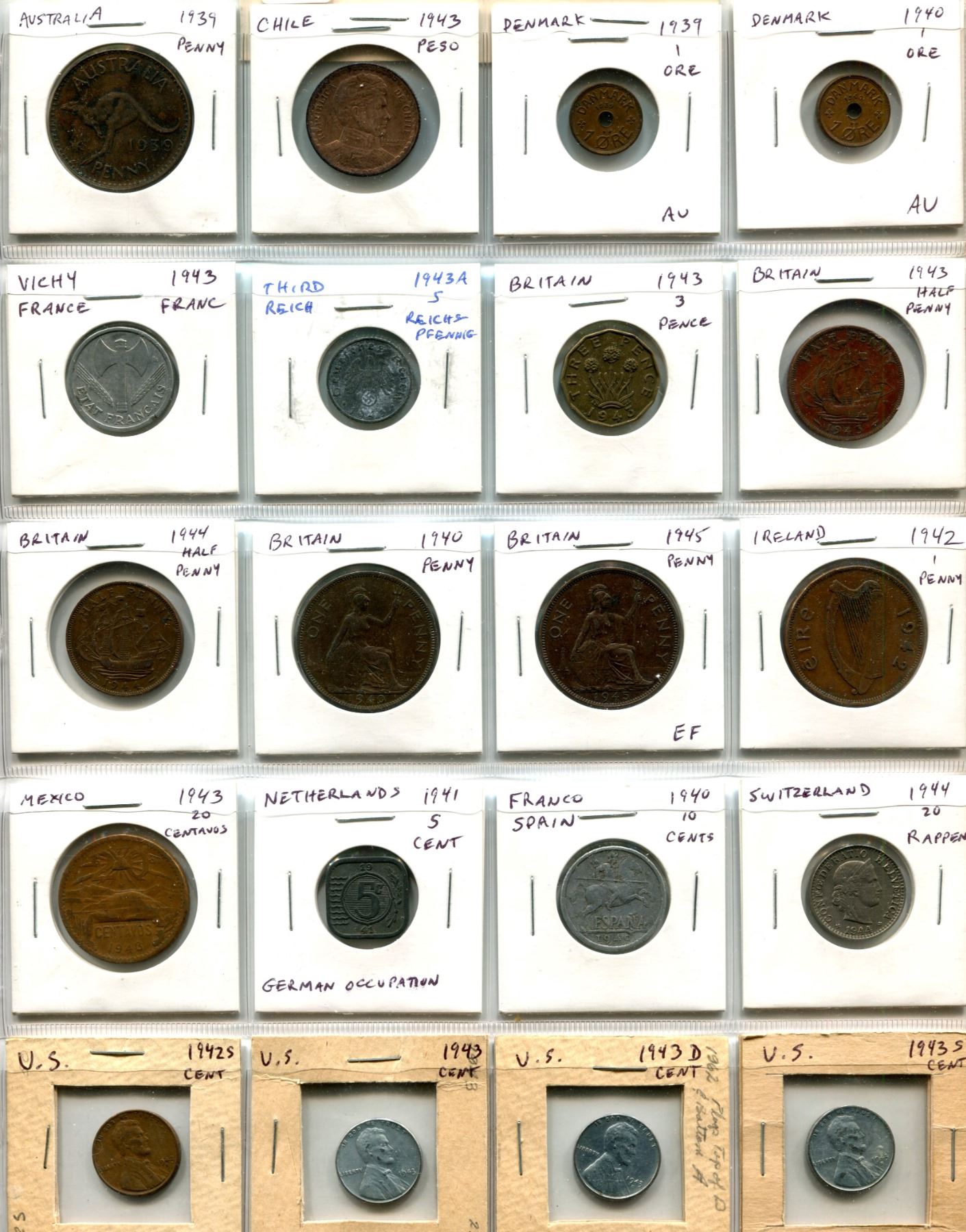 Lot of 20 World War II Coins from Australia, Chile, Denmark, Vichy France, German Third Reich, Great Britain, Ireland, Mexico, Netherlands under Germany Occupation, Franco Spain, Switzerland and U.S. All are dated 1939 – 1945. A nice selection.