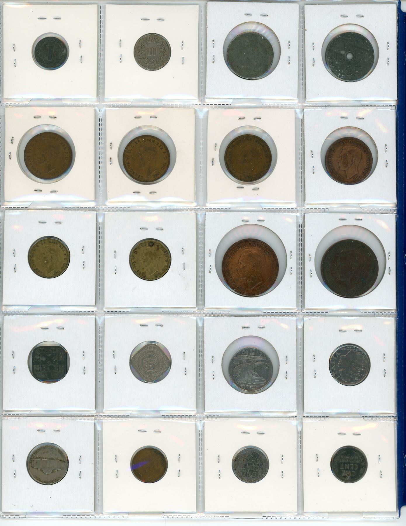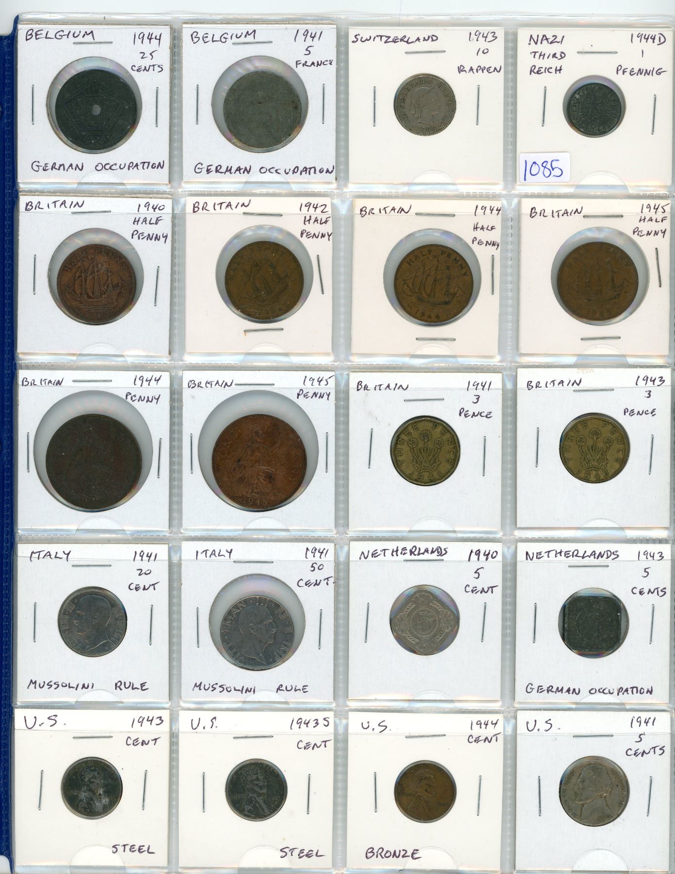 Lot of 20 World War II coins from Belgium under German occupation, Switzerland, Nazi Third Reich, Great Britain, Italy under Mussolini rule, Netherlands, Netherlands under German occupation, & the U.S.