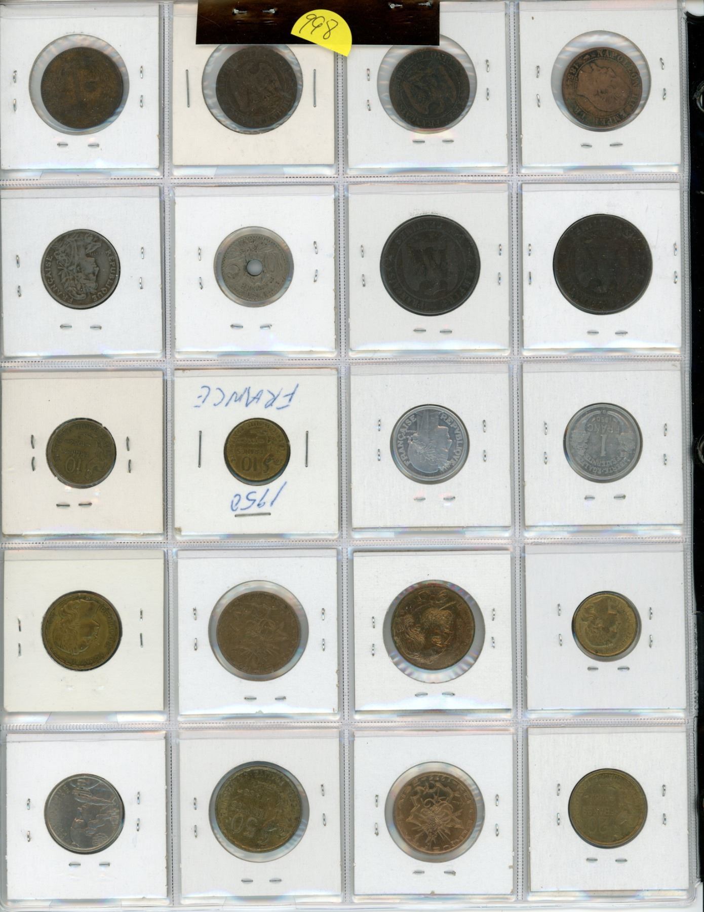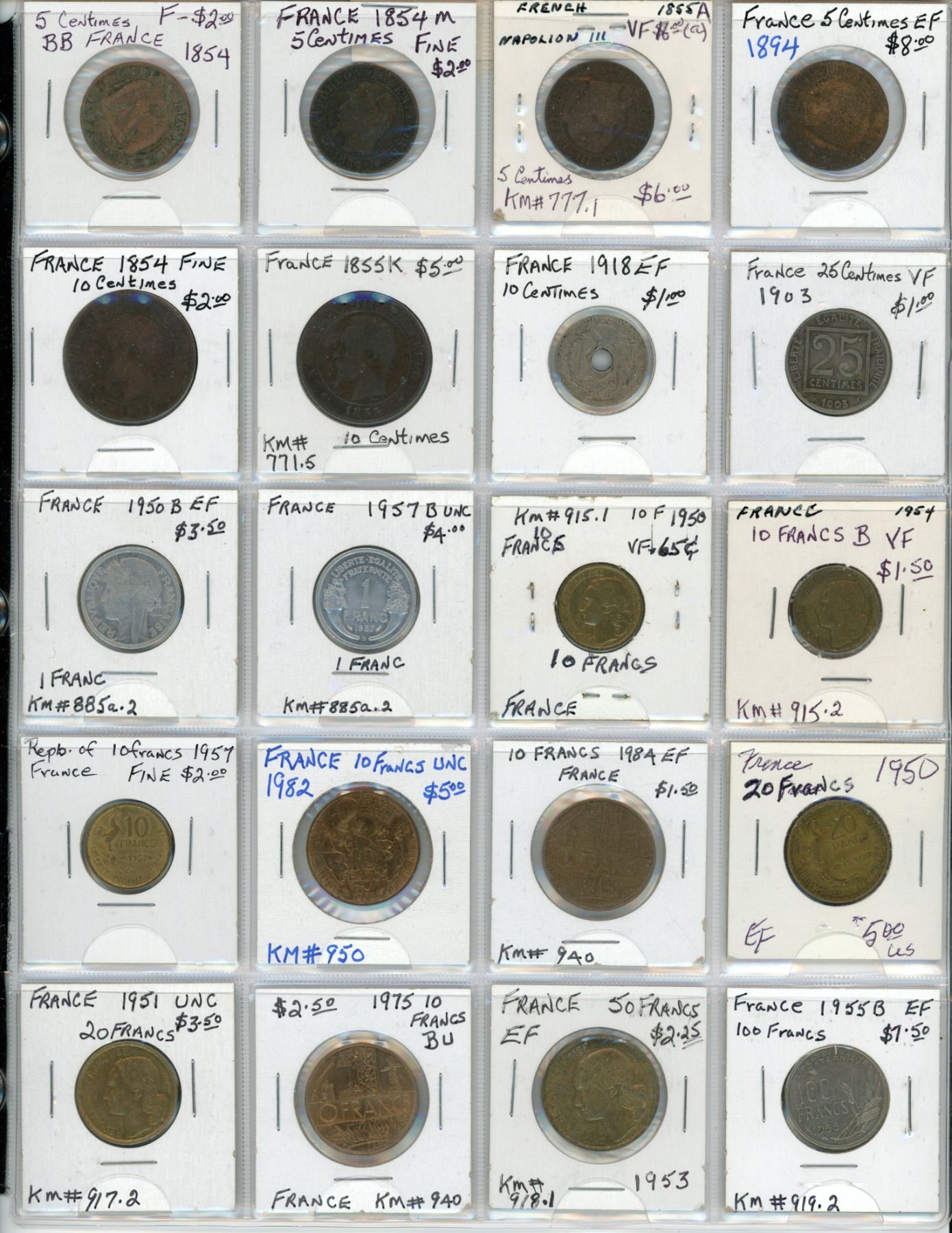 Lot of 20 coins from France. Coins date 1854 (Emperor Napoleon III) to 1984. Includes 6 coins from the 1800s, 1 from World War I and large denomination coins like 50 francs and 100 francs. A nice selection.