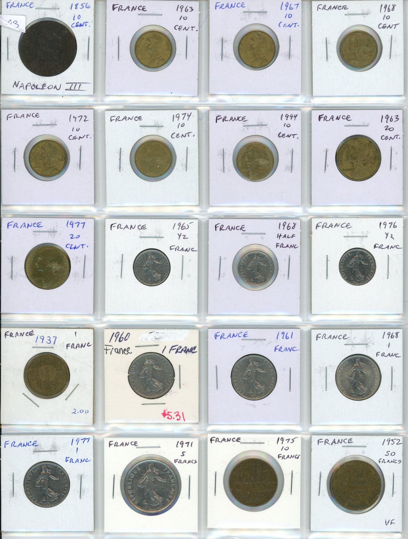 Lot of 20 coins from France. Includes 1856 10 Centimes from Emperor Napoleon III, plus newer coins up to 50 Francs.