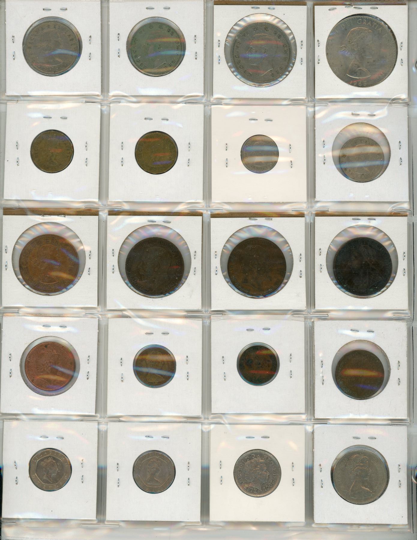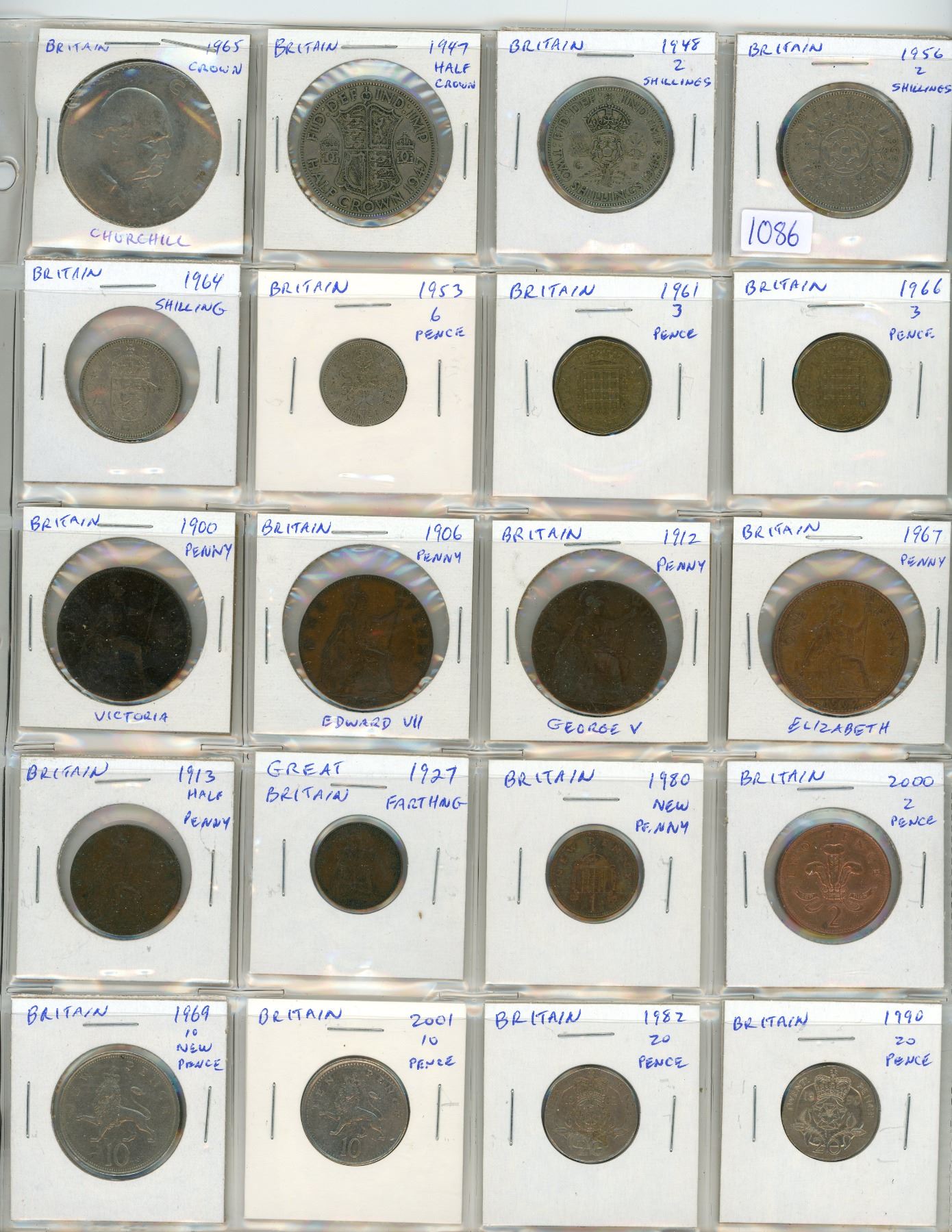 Lot of 20 coins from Great Britain. Includes Crown, Half Crown, 2 Shillings, Shilling, 6 Pence, 3 Pence, Penny, Half Penny, Farthing, plus New Penny, 2 Pence, 10 New Pence, 10 Pence, & 20 Pence.