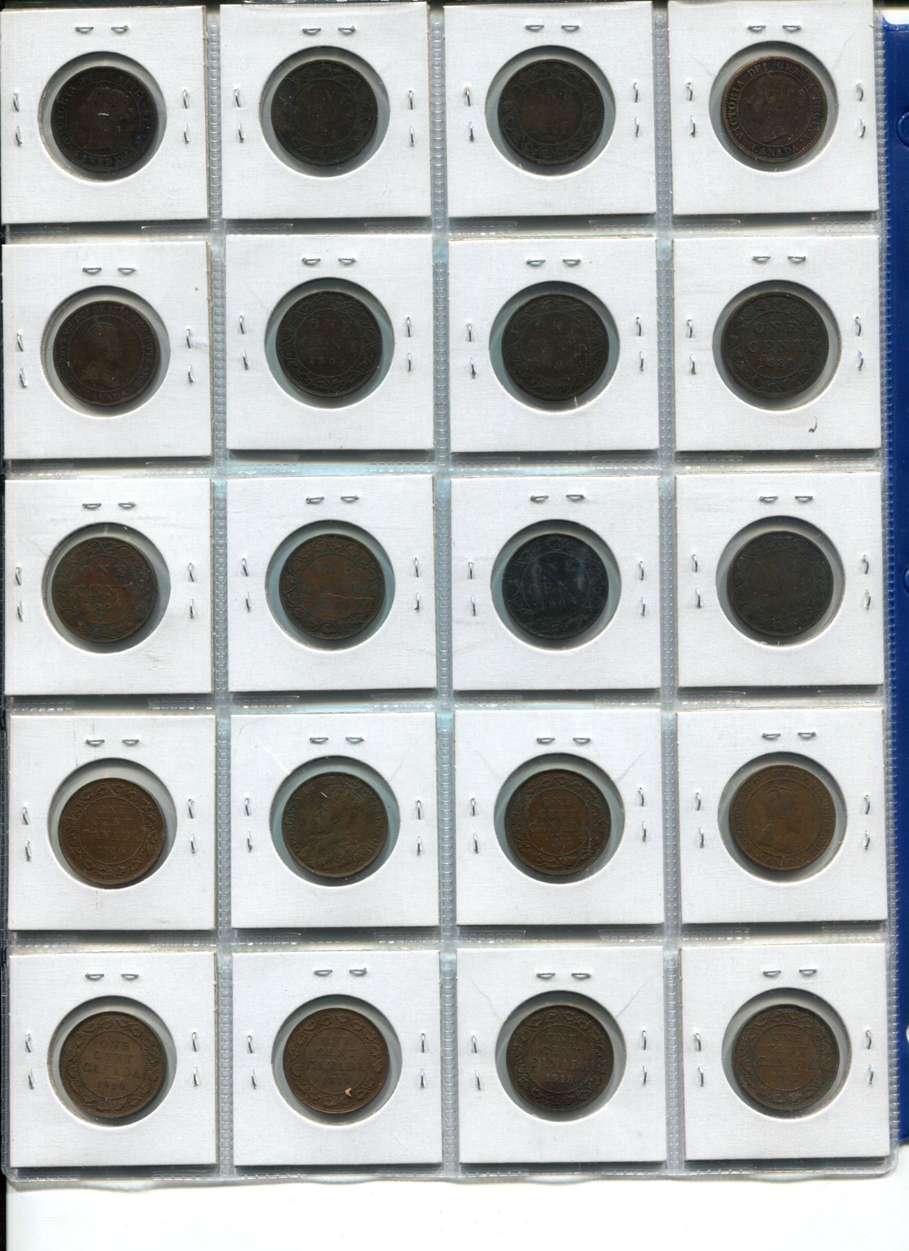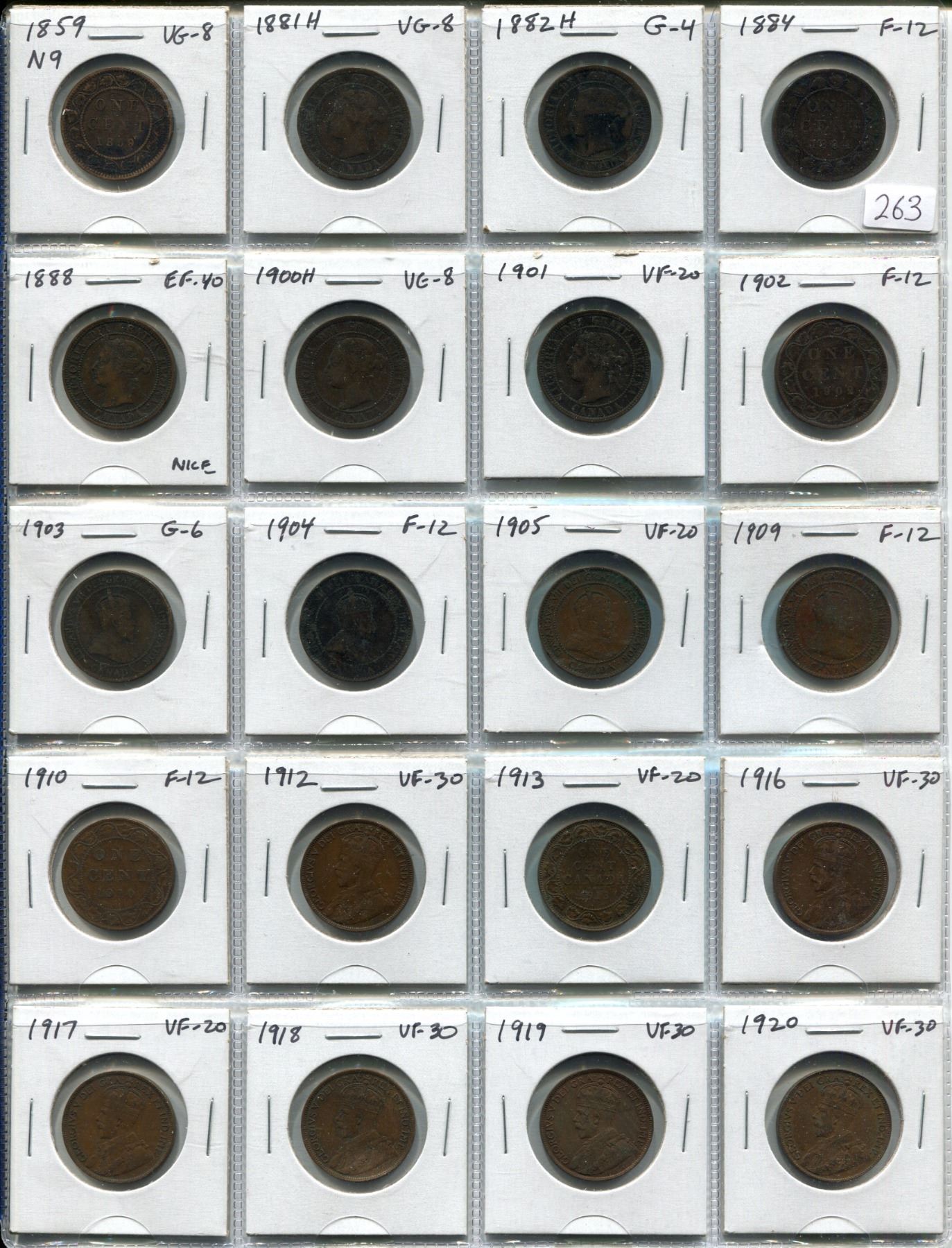Lot of 20 different Canadian Large Cents. Includes 1859 Narrow 9, 1881H, 1882H, 1884, 1888, 1900H, 1901, 1902, 1903, 1904, 1905, 1909, 1910, 1912, 1913, 1916, 1917, 1918, 1919 & 1920. Coins grade VG-8 to EF-40. A nice selection.