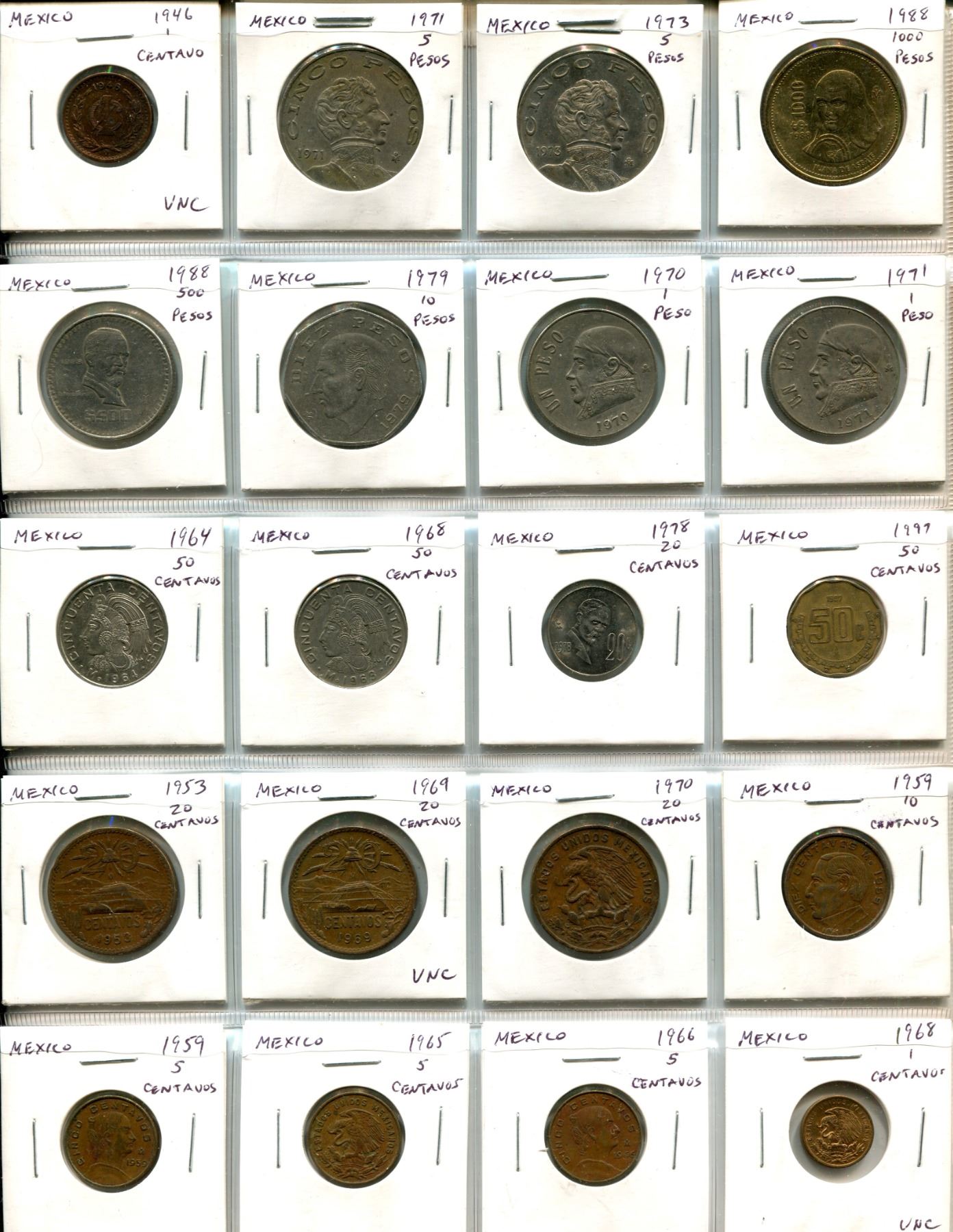 Lot of 20 old Mexican coins including Unc 1946 centavo and high denominations like 1000 pesos. 3 coins are Unc.