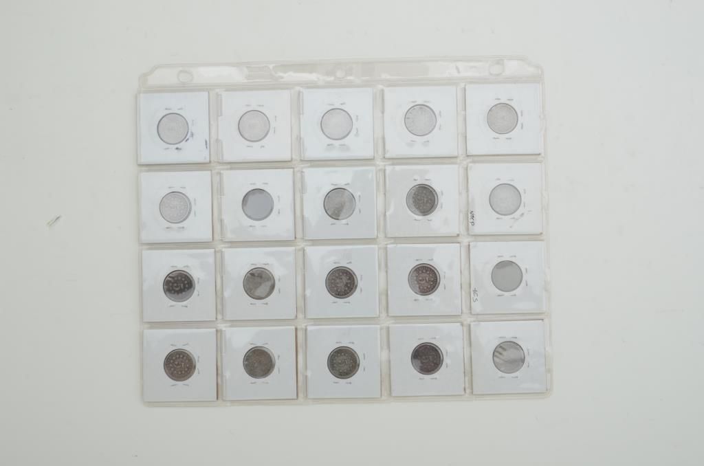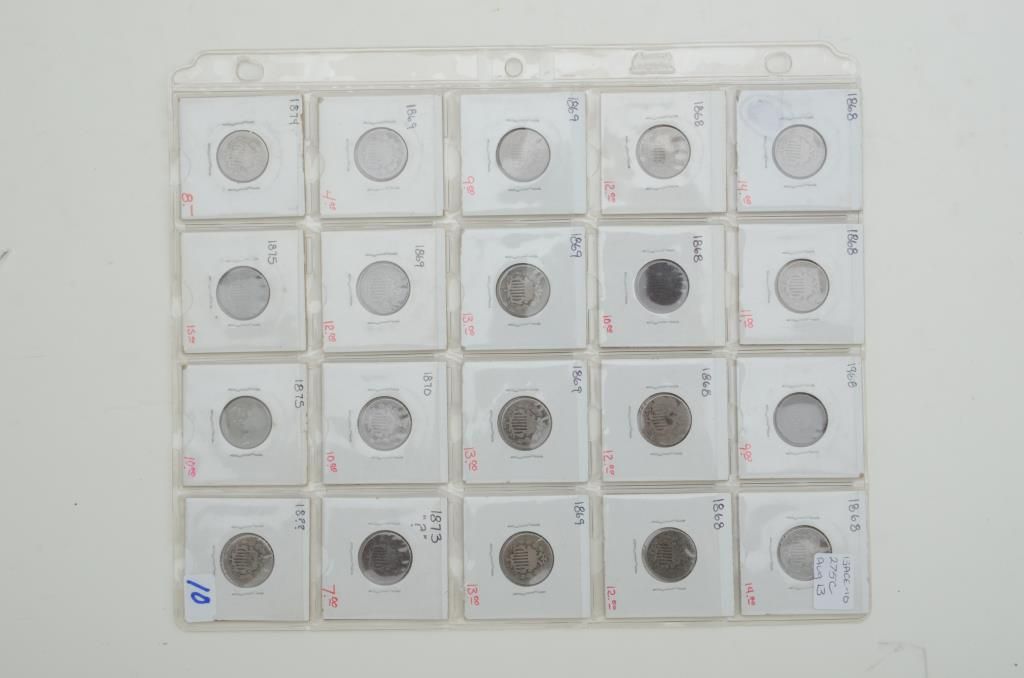 Lot of 20 shield nickels, various dates, ungraded. Est.: $125-$250.