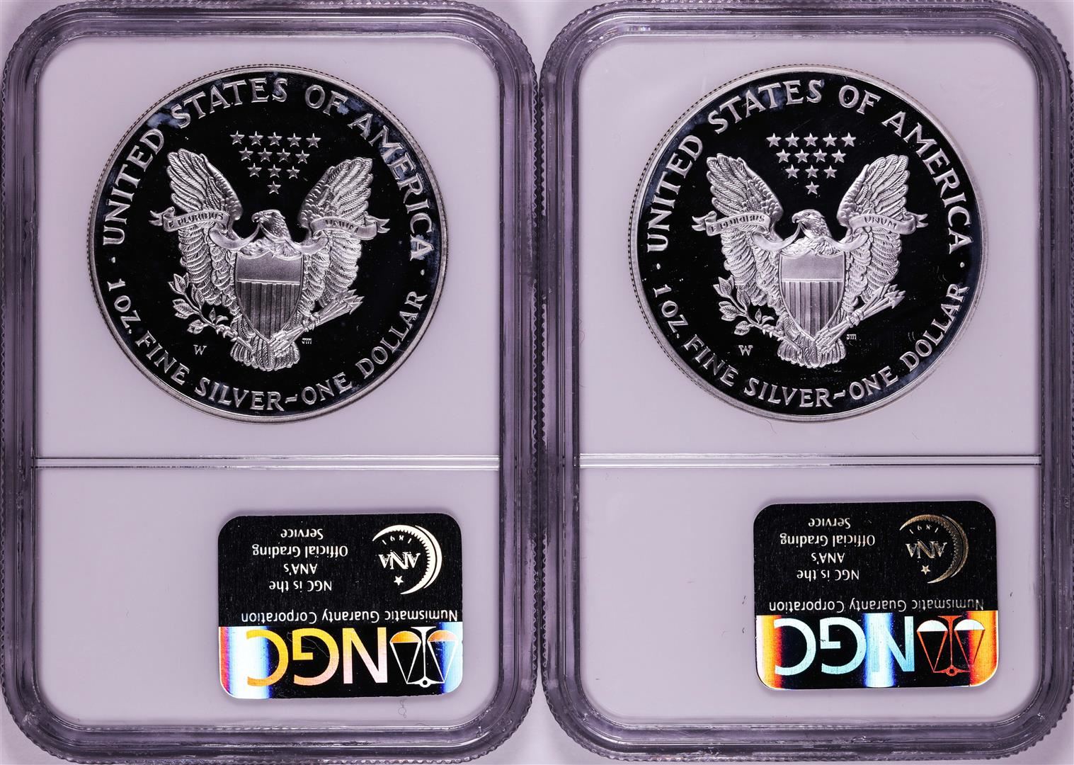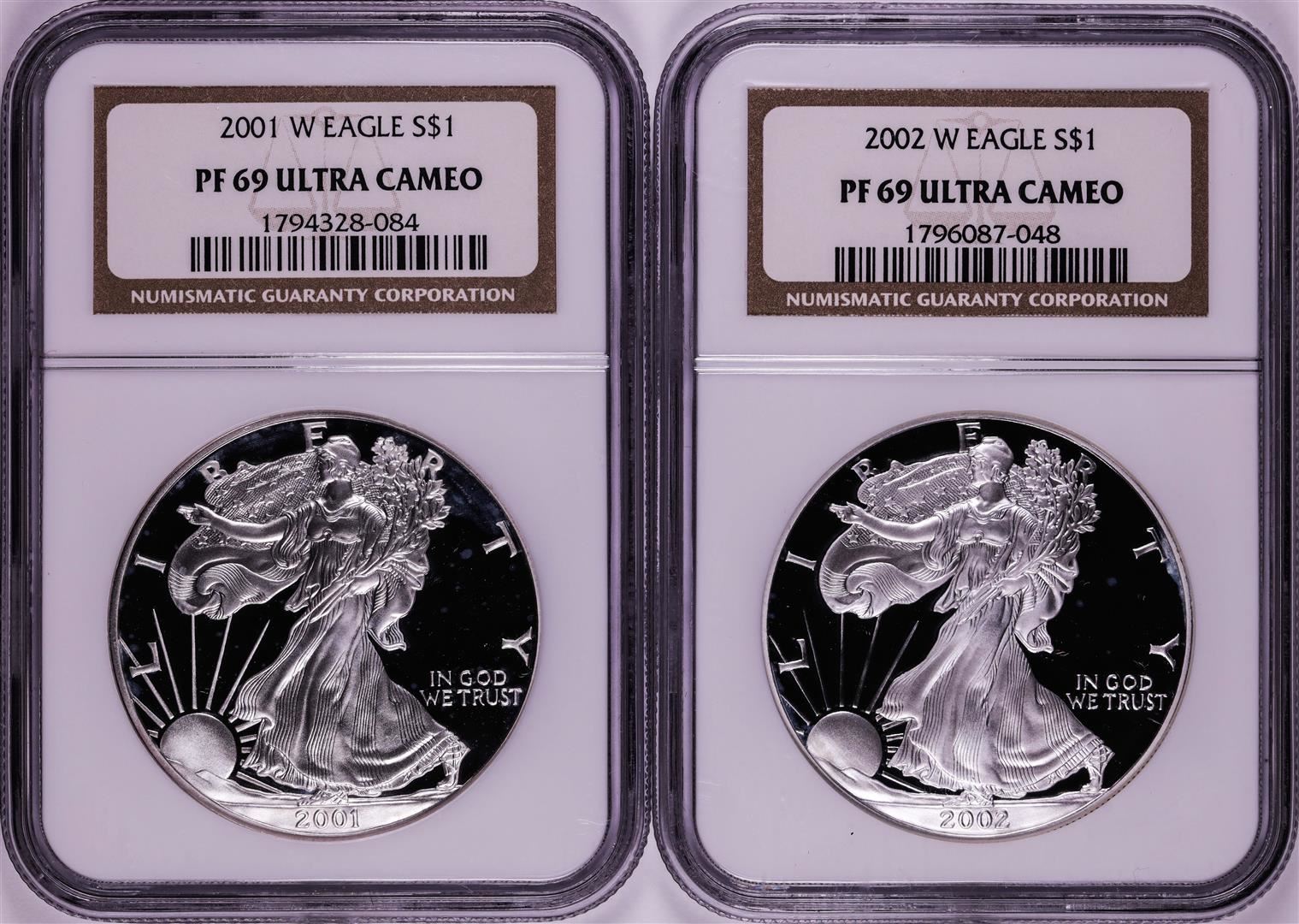 One Lot of 2001-2002 $1 Proof American Silver Eagle Coins NGC PF69 Ultra Cameo. NGC Certified.