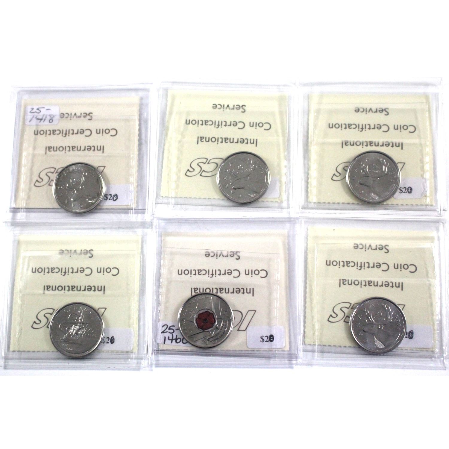 Lot of 2001-2004 Canada 25-cent ICCS Certified MS-65 - 2001P, 2003P, 2003P New Effigy, 2004P, 2004P St. Croix & 2004P Poppy. 6pcs