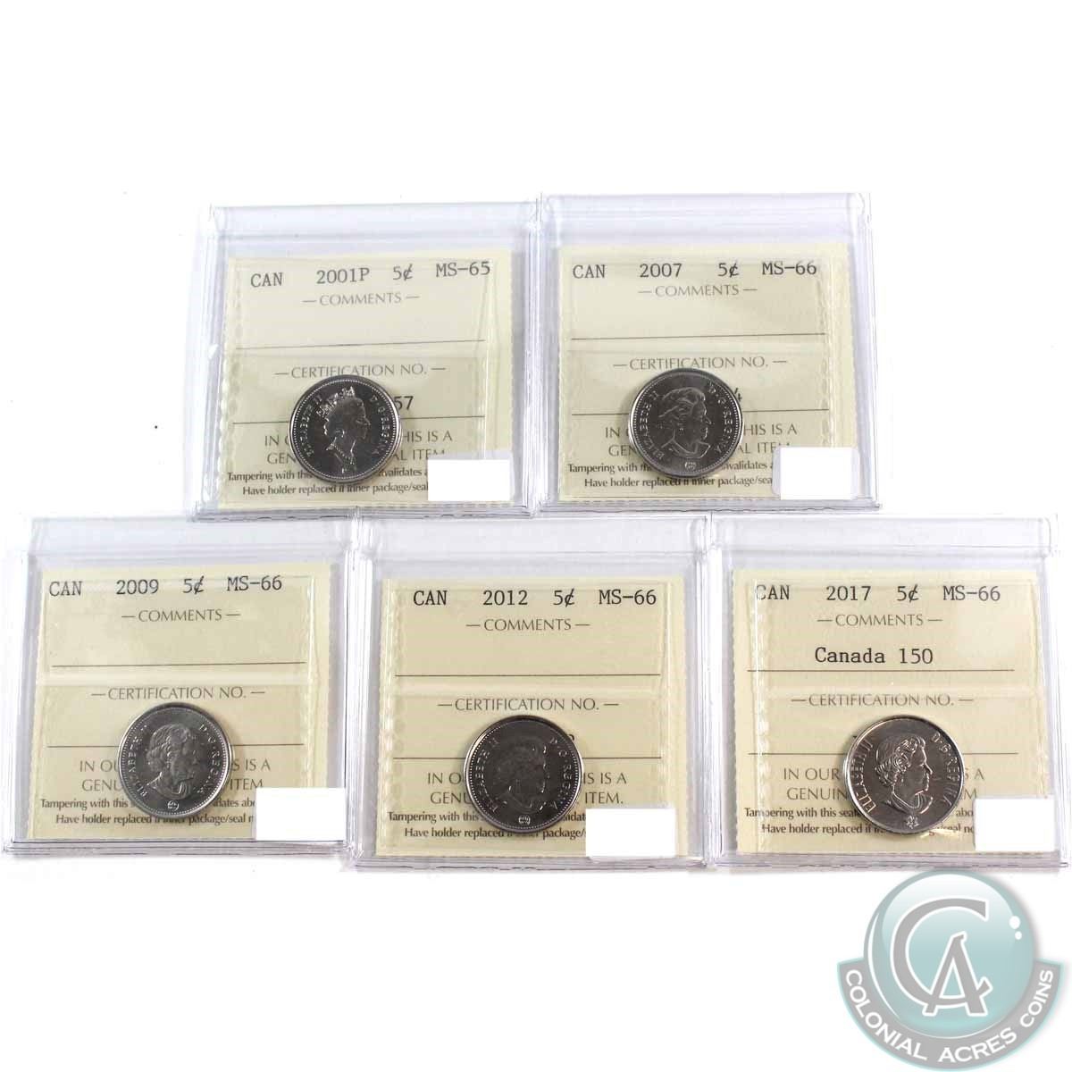 Lot of 2001-2017 Canada 5-cent ICCS Certified - 2001P MS-65, 2007 MS-66, 2009 MS-66, 2012 MS-66 & 2017 Canada 150 MS-66. 5pcs