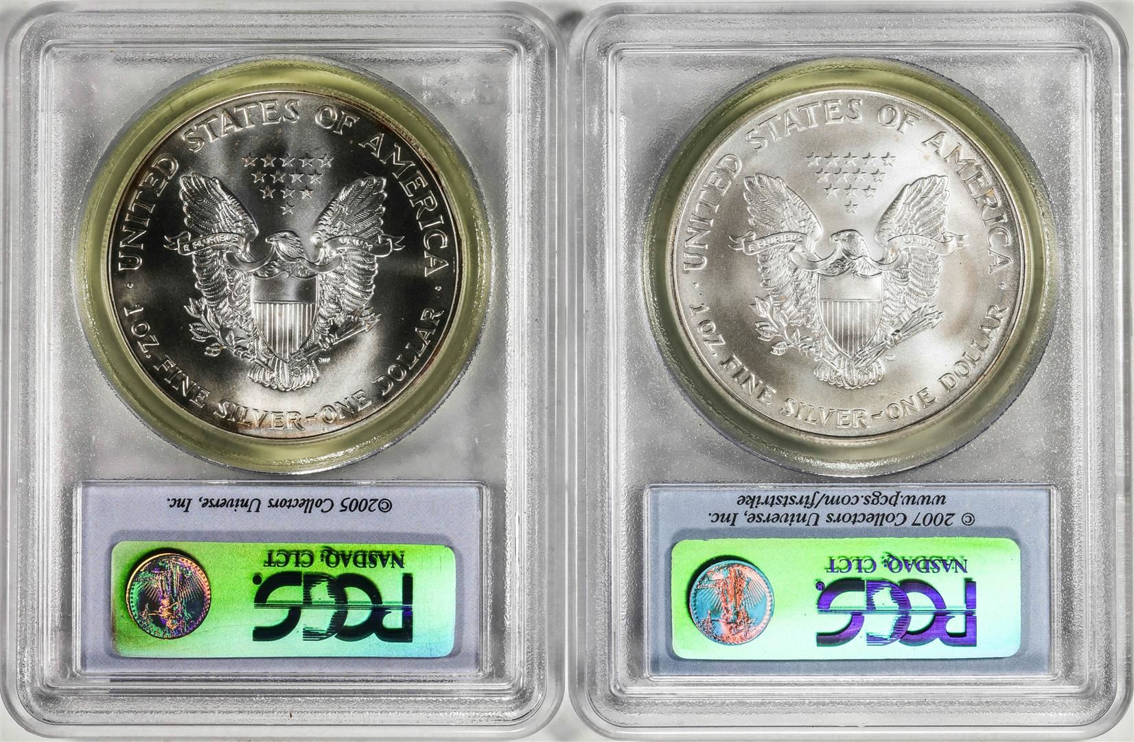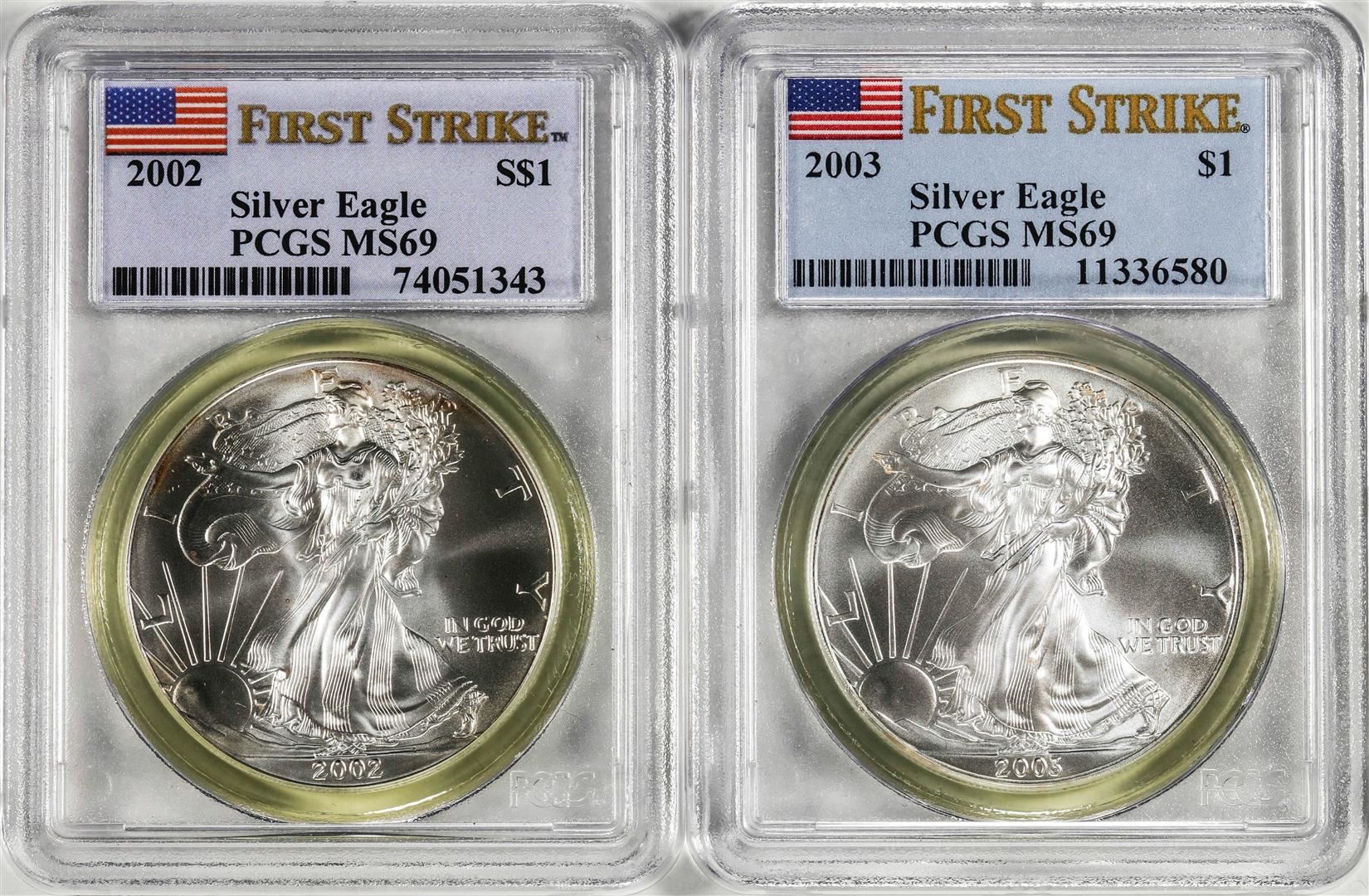 One Lot of 2002 & 2003 $1 American Silver Eagle Coins PCGS MS69 First Strike. PCGS Graded.