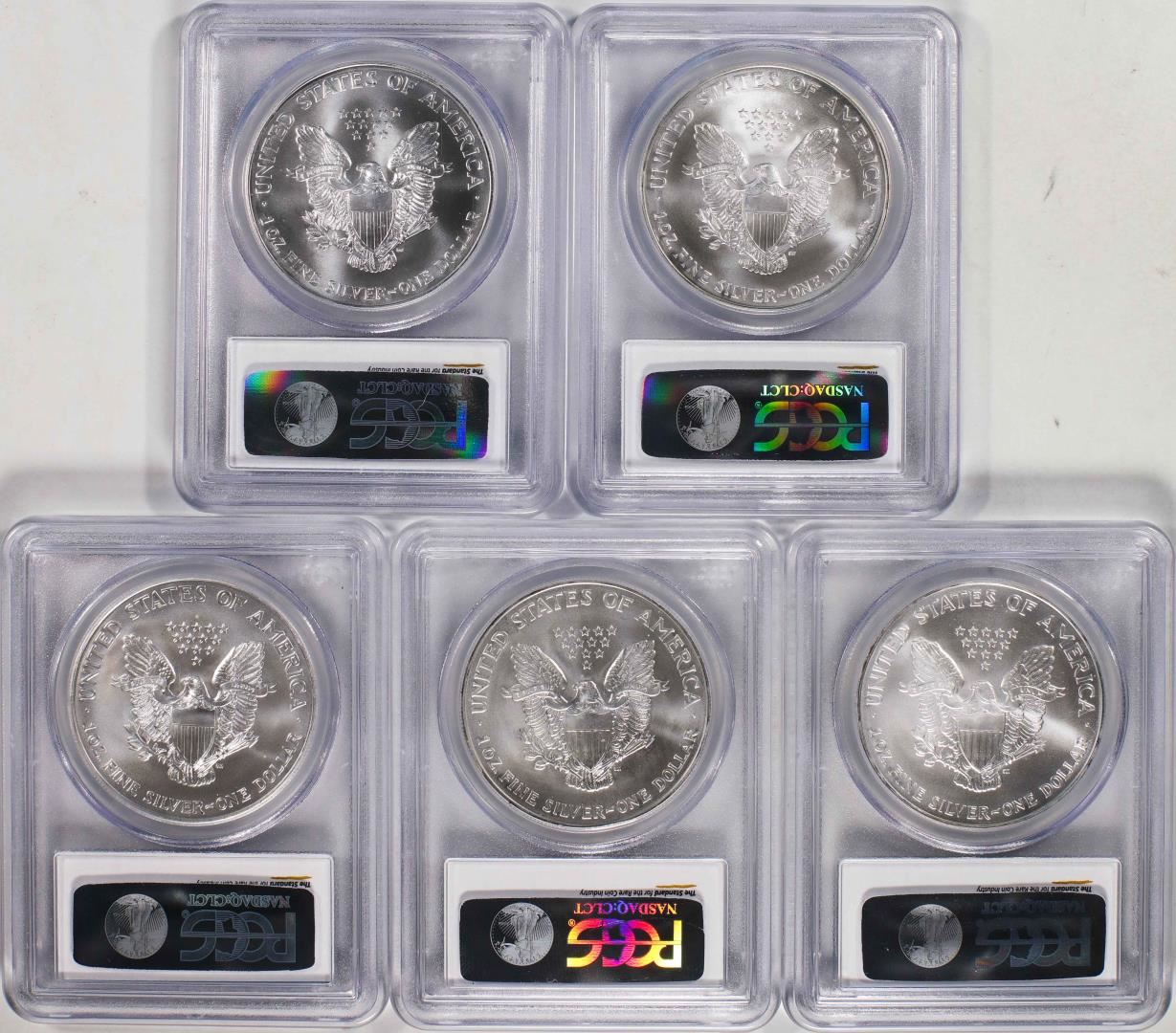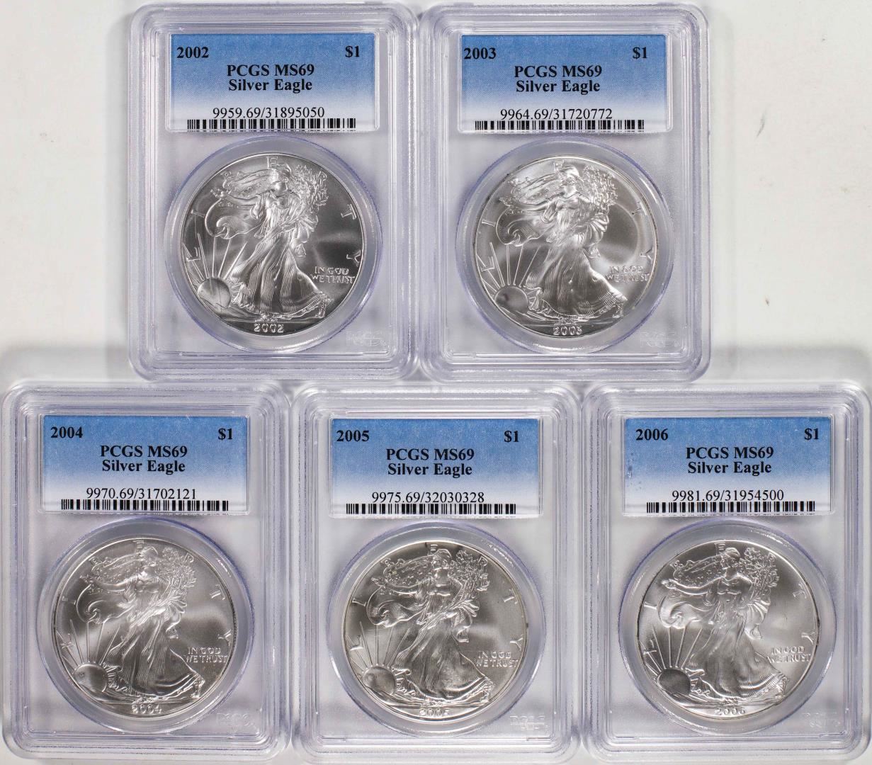 One Lot of 2002-2006 $1 American Silver Eagle Coins PCGS MS69. PCGS Graded.