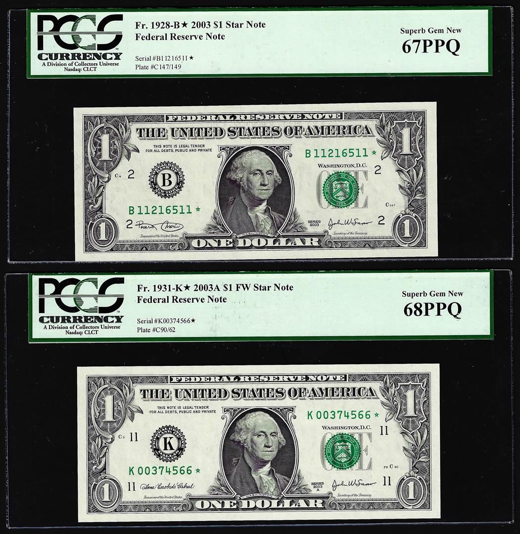 One Lot of 2003 & 2003A $1 Federal Reserve STAR Notes PCGS Superb Gem New 67PPQ/68PPQ. PCGS Graded.