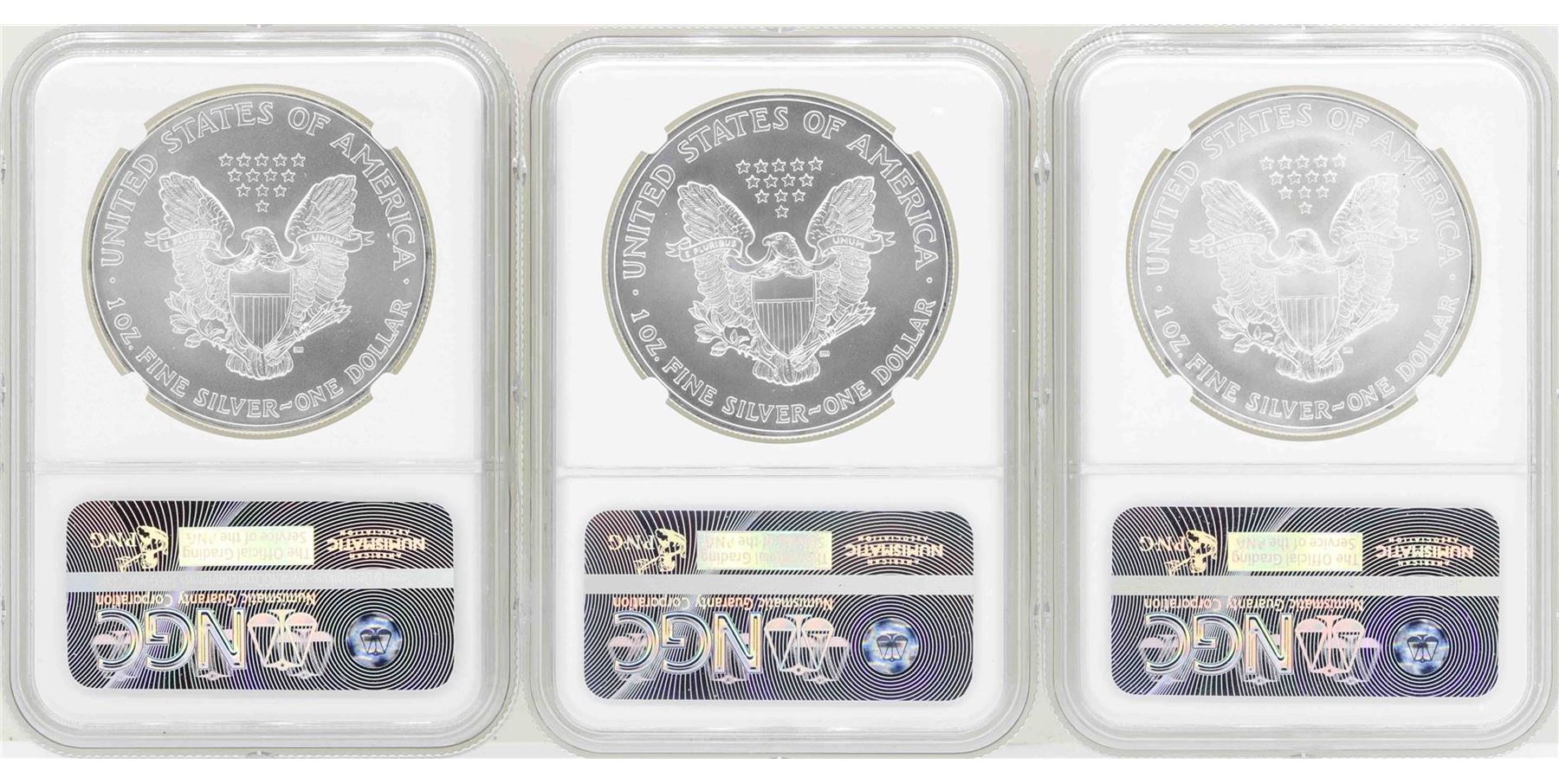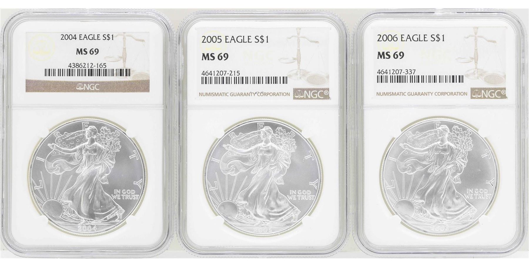 One Lot of 2004-2006 $1 American Silver Eagle Coins NGC MS69. NGC Certified.