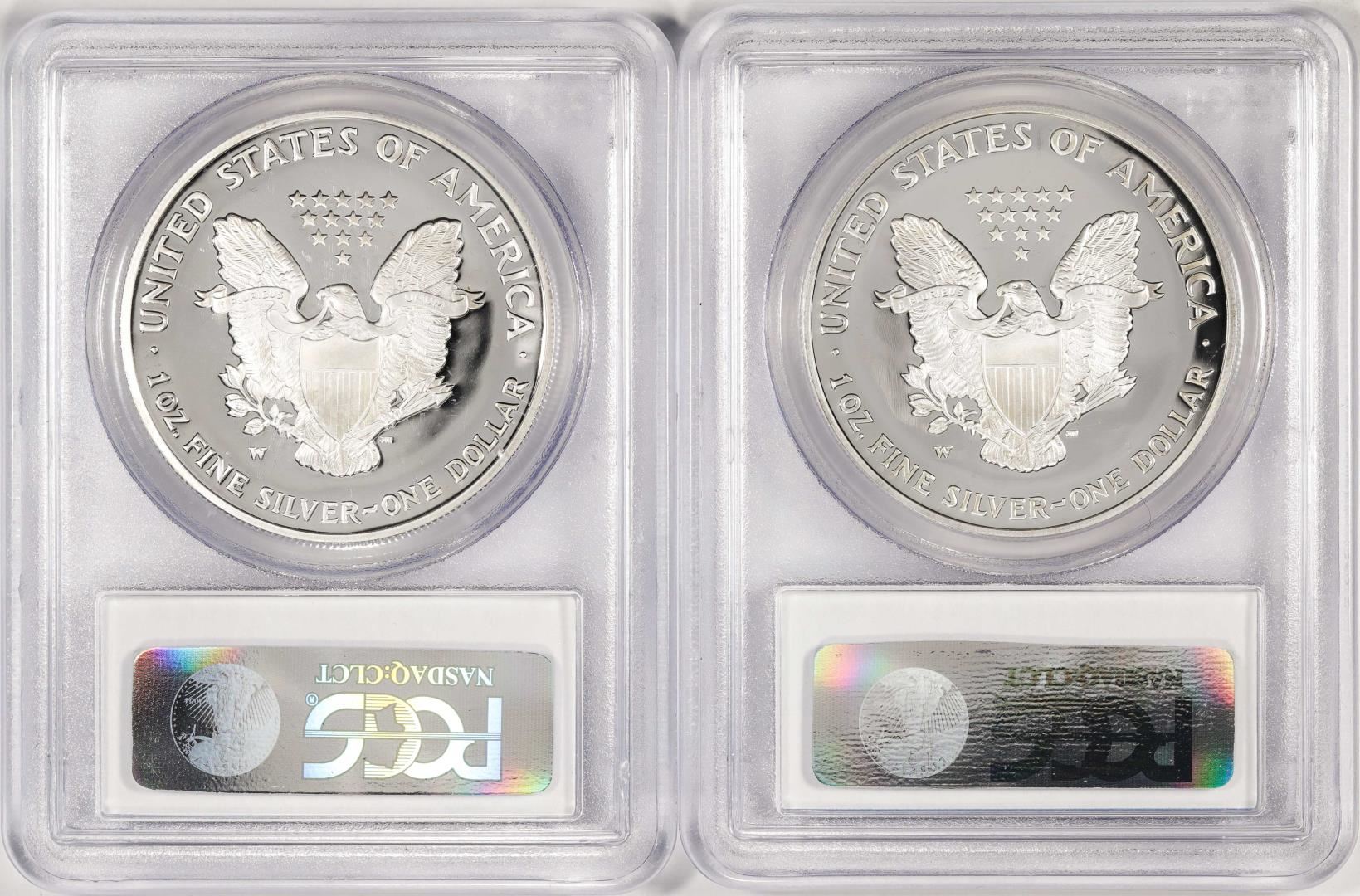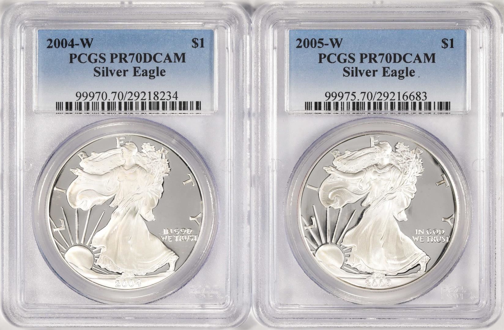 One Lot of 2004-W & 2005-W $1 Proof American Silver Eagle Coins PCGS PR70DCAM. PCGS Graded.