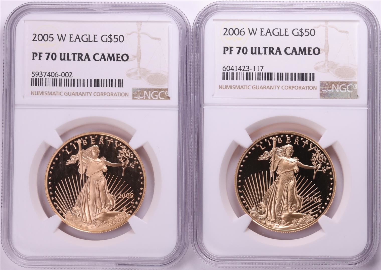 One Lot of 2005-W & 2006-W $50 Proof American Gold Eagle Coins NGC PF70 Ultra Cameo. NGC Certified.
