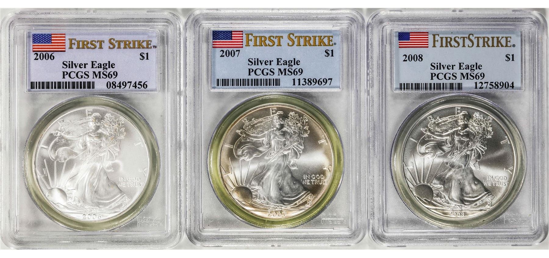Lot of 2006-2008 $1 American Silver Eagle Coins PCGS MS69 First Strike