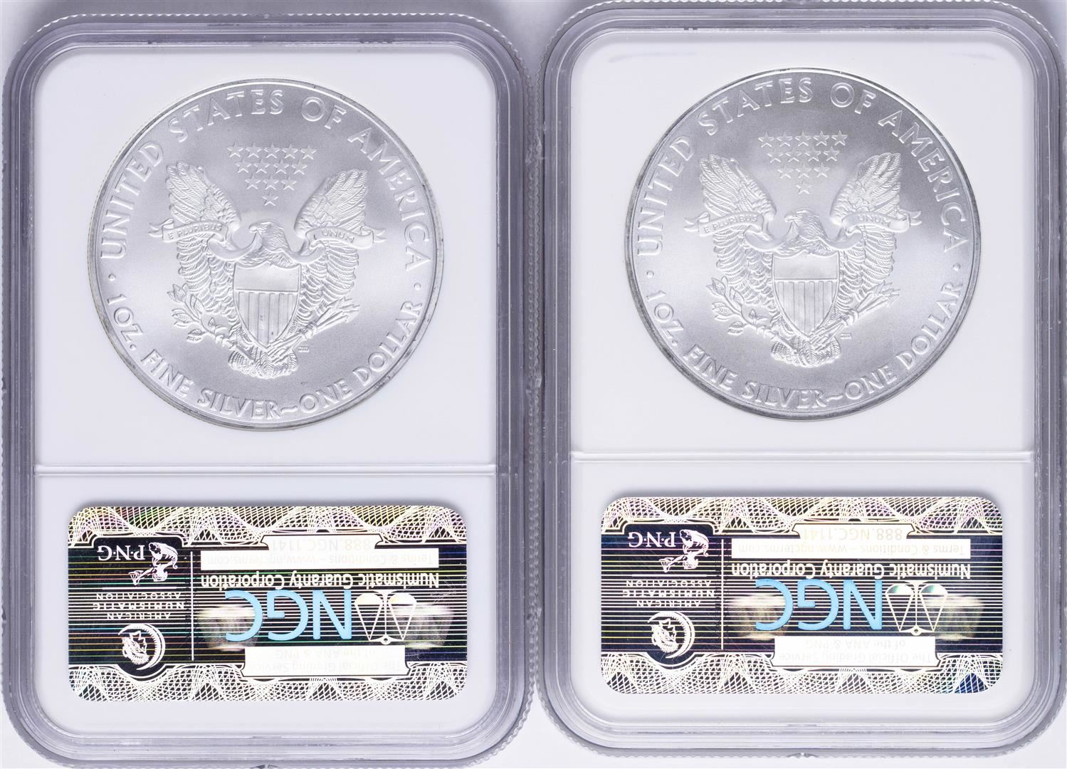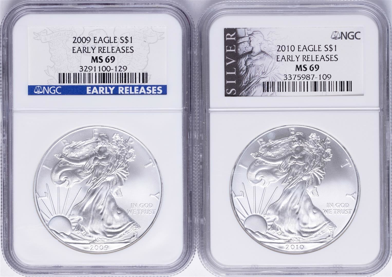 One Lot of 2009 & 2010 $1 American Silver Eagle Coins NGC MS69 Early Releases. NGC Certified.