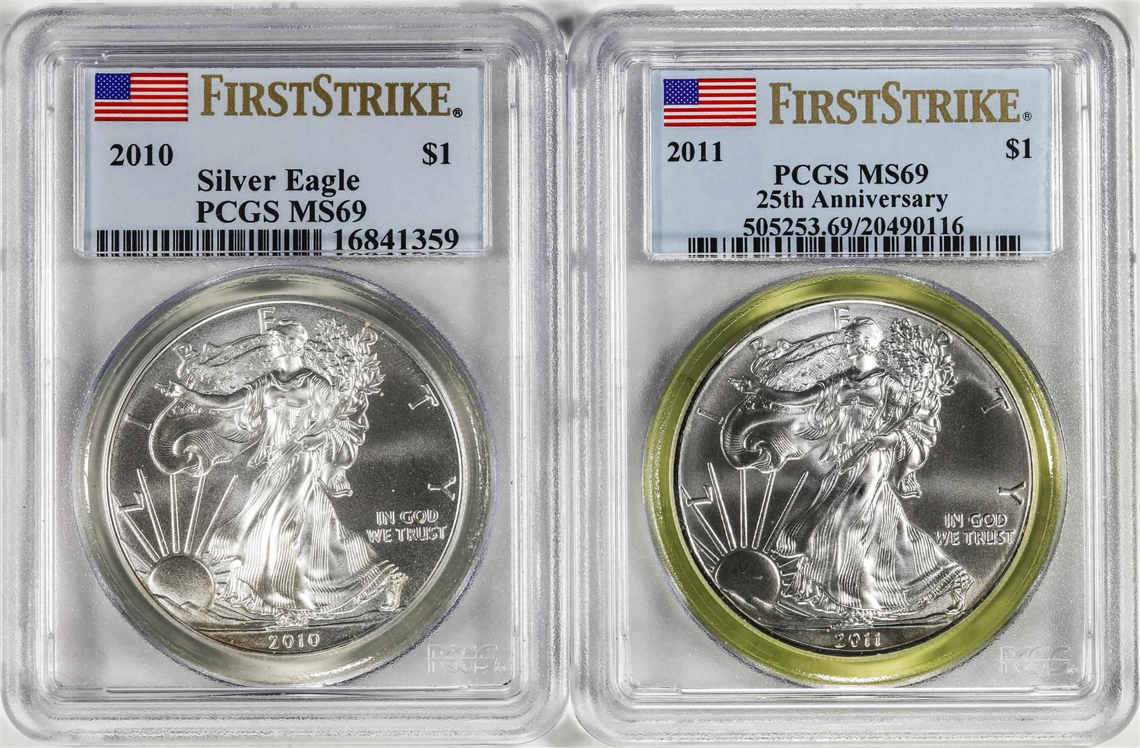 One Lot of 2010 & 2011 $1 American Silver Eagle Coins PCGS MS69 First Strike. PCGS Graded.