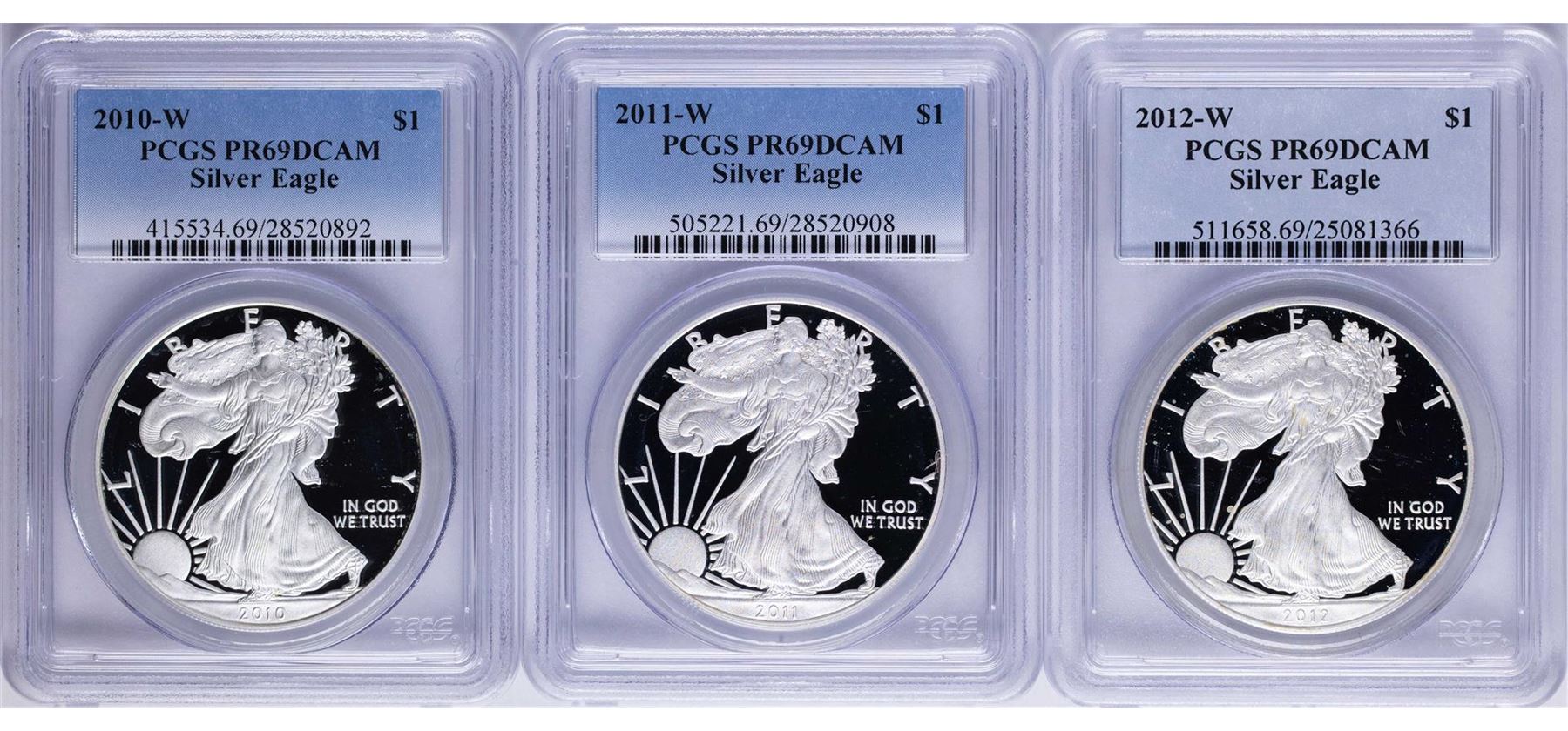 One Lot of 2010-W to 2012-W $1 American Silver Eagle Proof Coins PCGS PR69DCAM. PCGS Graded.