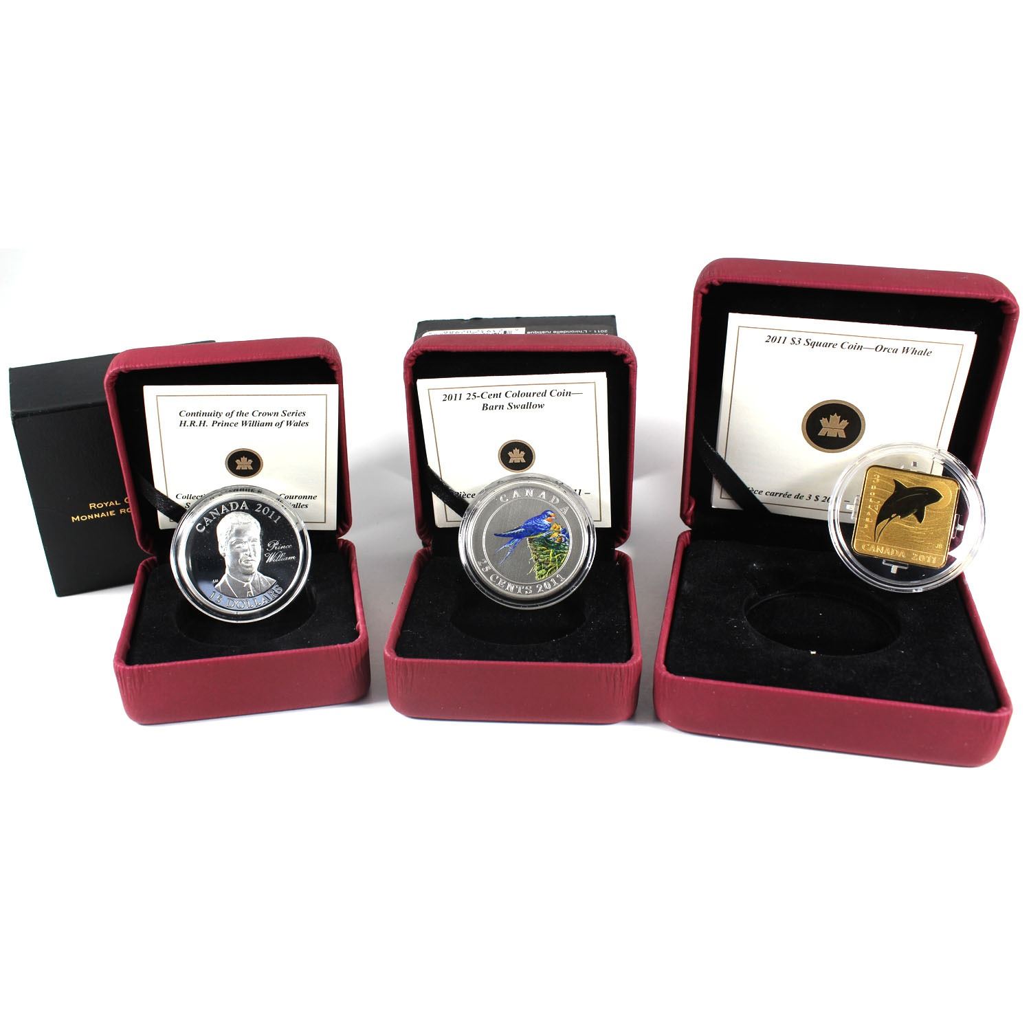 Lot of 2011 Canada RCM Items - 25-cent Birds of Canada - Barn Swallow, $3 Wildlife Conservation - Orca Whale Sterling Silver & $15 H.R.H. Prince William of Wales Sterling Silver ($3 missing outer sleeve, other outer sleeves are worn, 25-cent coin has toning on the back & $15 coin lightly toned on back). 3pcs