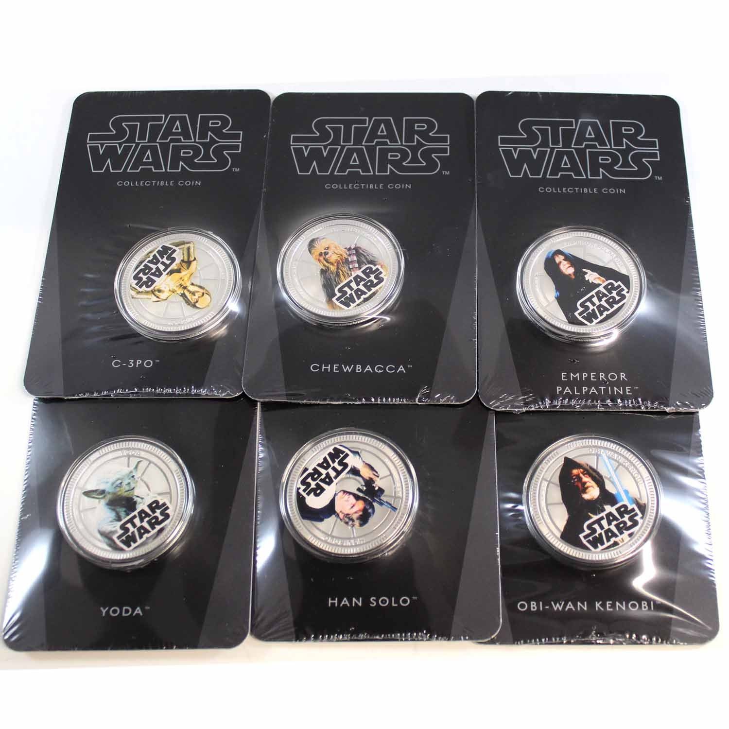 Lot of 2011 Niue Star Wars Coloured Silver Plated Collectable Coins in Original Plastic Wrap. You will receive Yoda, Emperor Palpatine, C-3PO, Chewbacca, Obi-Wan Kenobi & Han Solo. 6pcs