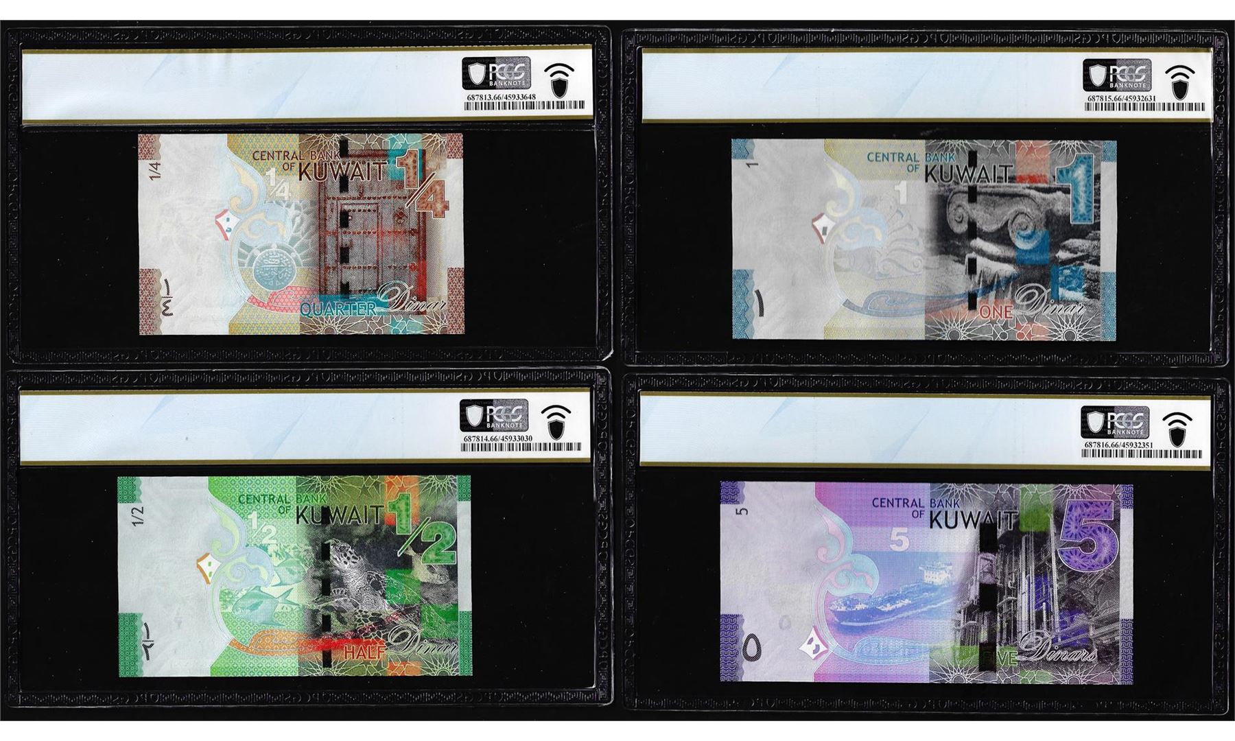 One Lot of 2014 Kuwait 1/4, 1/2, 1 & 5 Dinar Notes PCGS Gem Uncirculated 66PPQ. PCGS Graded.