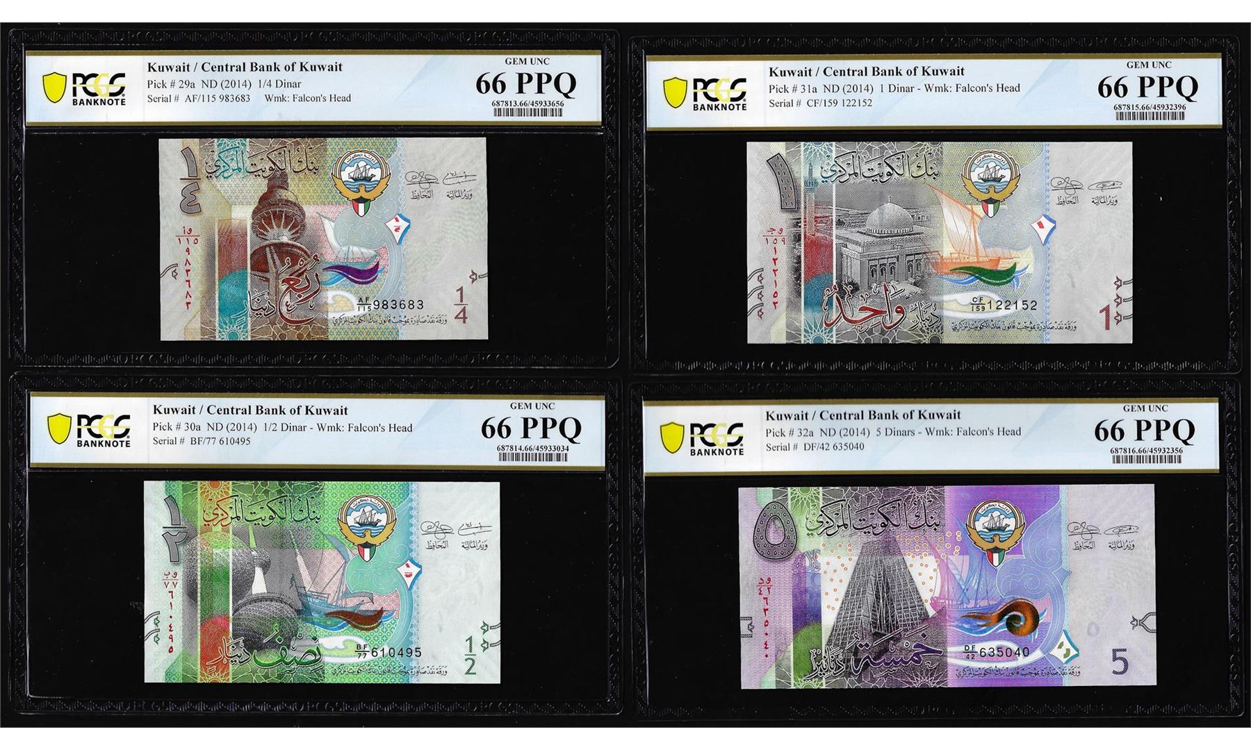One Lot of 2014 Kuwait 1/4, 1/2, 1 & 5 Dinar Notes PCGS Gem Uncirculated 66PPQ. PCGS Graded.