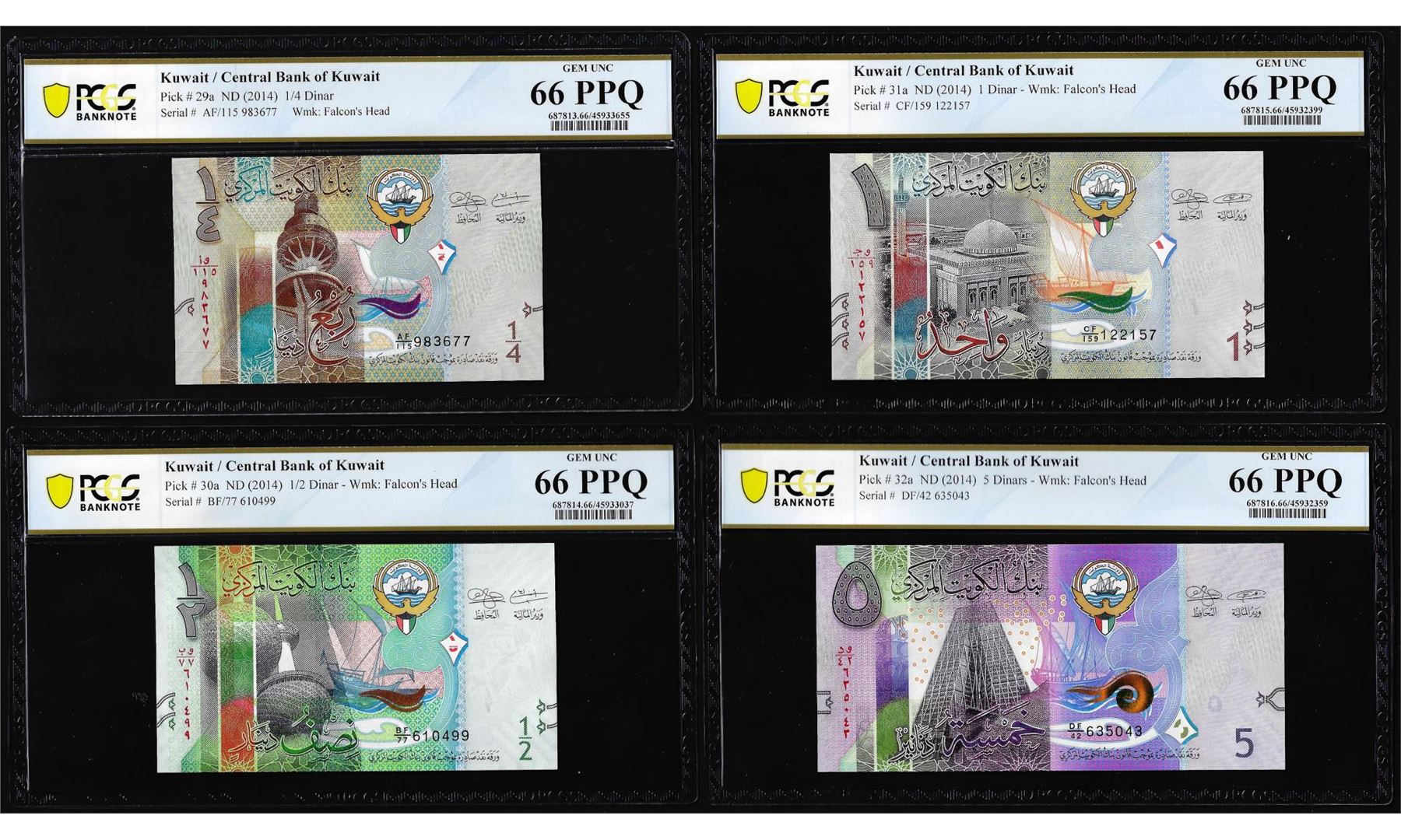 One Lot of 2014 Kuwait 1/4, 1/2, 1 & 5 Dinar Notes PCGS Gem Uncirculated 66PPQ. PCGS Graded.