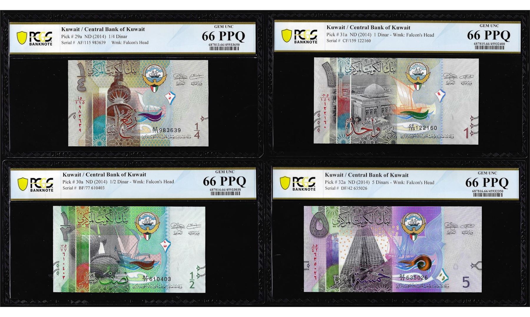 One Lot of 2014 Kuwait 1/4, 1/2, 1 & 5 Dinar Notes PCGS Gem Uncirculated 66PPQ. PCGS Graded.