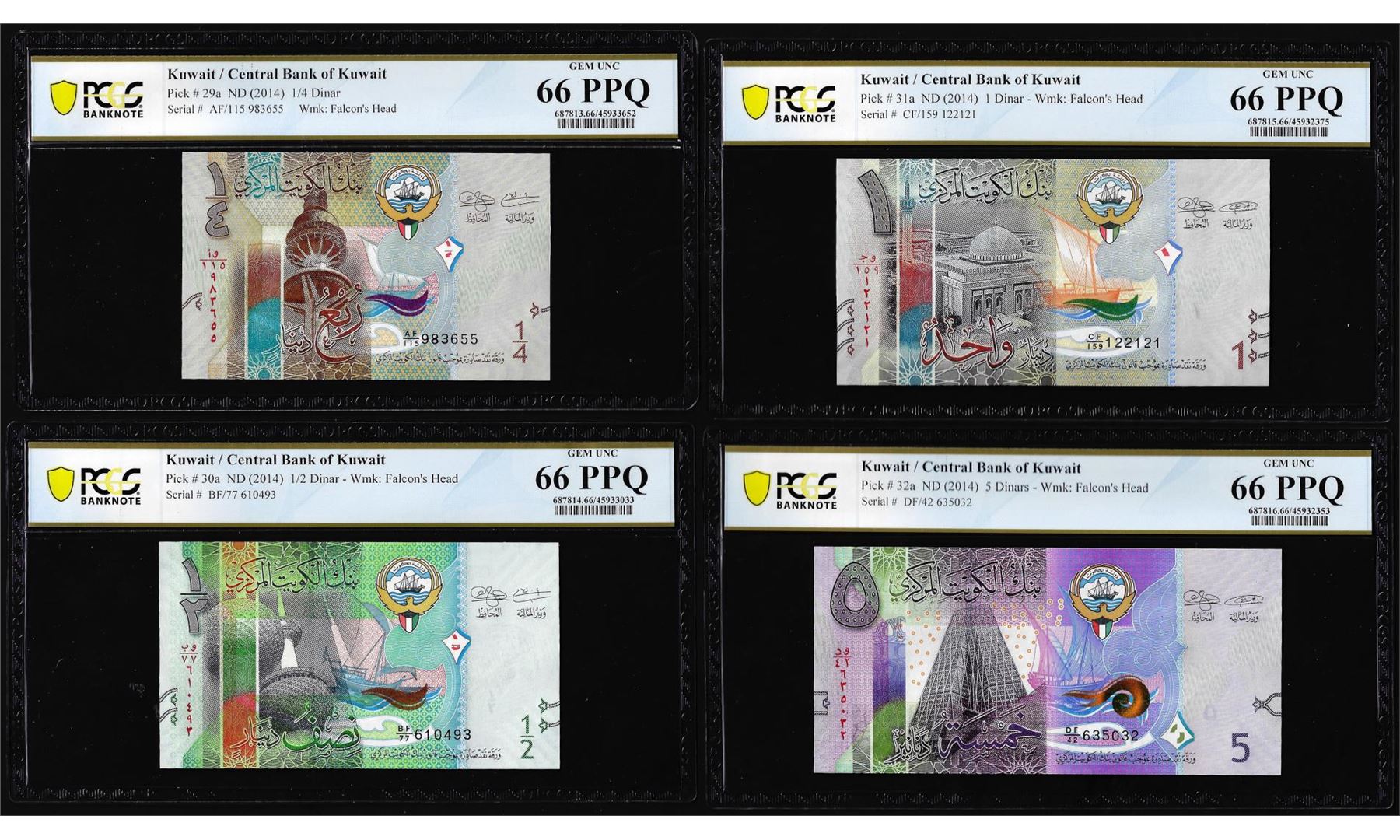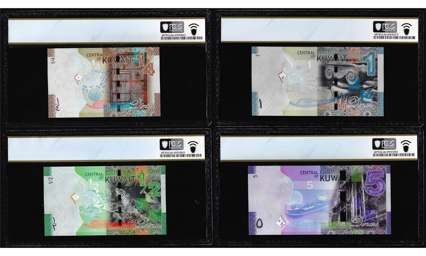 One Lot of 2014 Kuwait 1/4, 1/2, 1 & 5 Dinar Notes PCGS Gem Uncirculated 66PPQ. PCGS Graded.