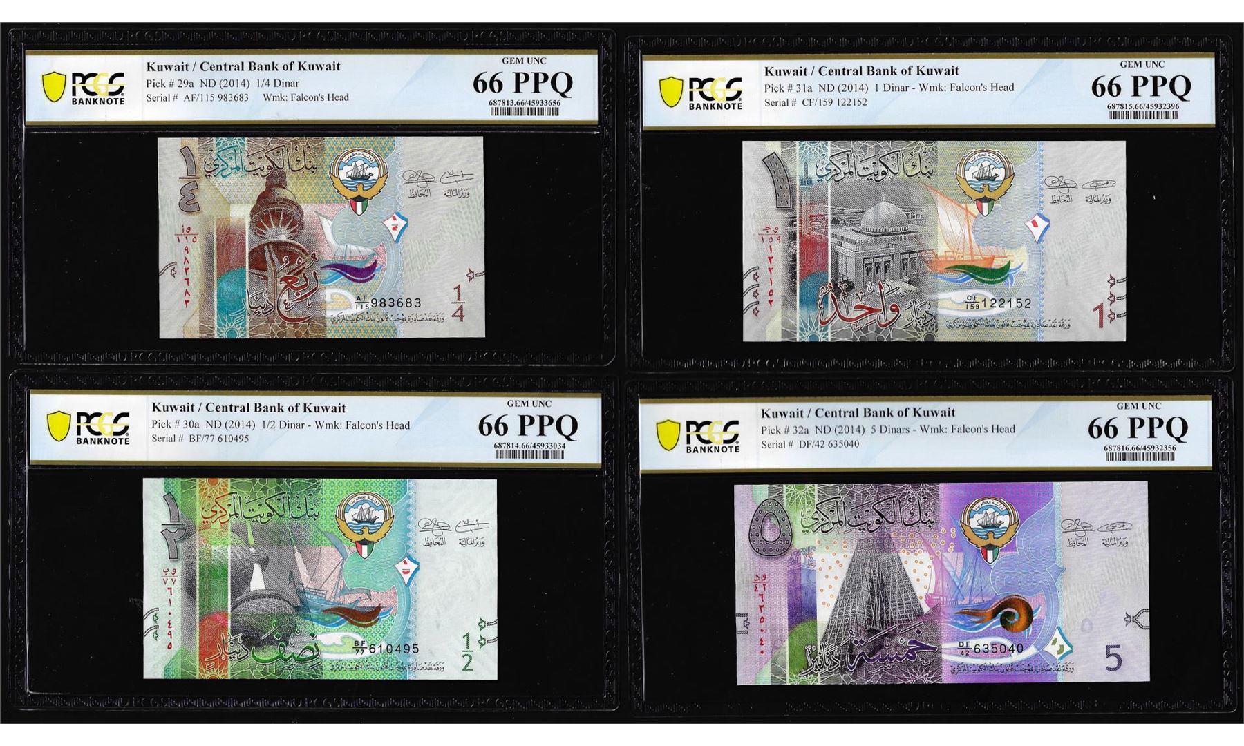Lot of 2014 Kuwait 1/4, 1/2, 1 & 5 Dinar Notes PCGS Gem Uncirculated 66PPQ