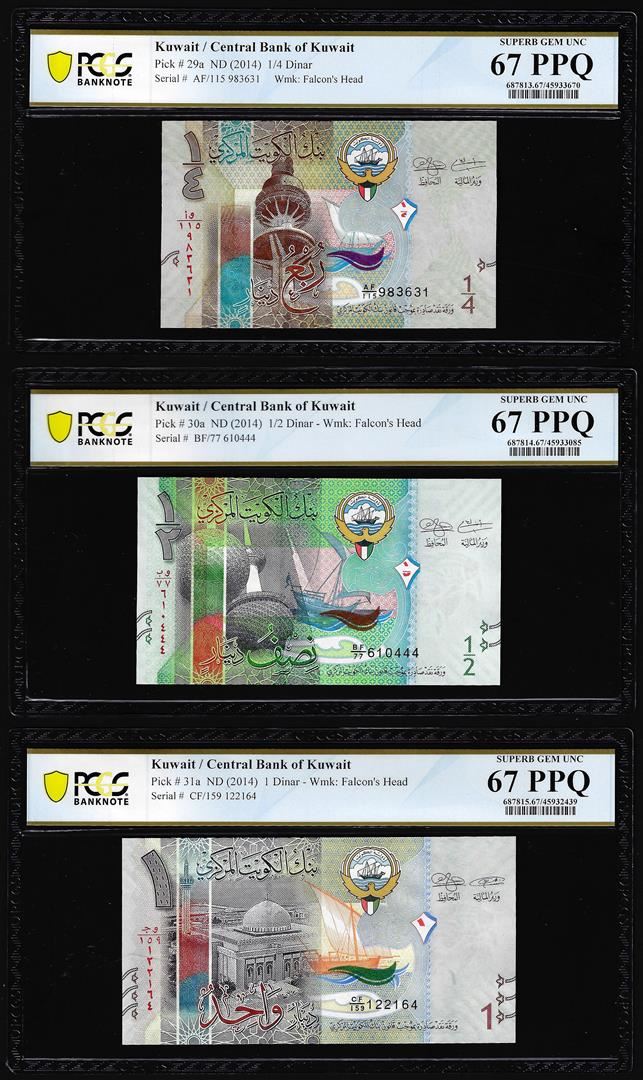 One Lot of 2014 Kuwait 1/4, 1/2 & 1 Dinar Notes PCGS Superb Gem Uncirculated 67PPQ. PCGS Graded.