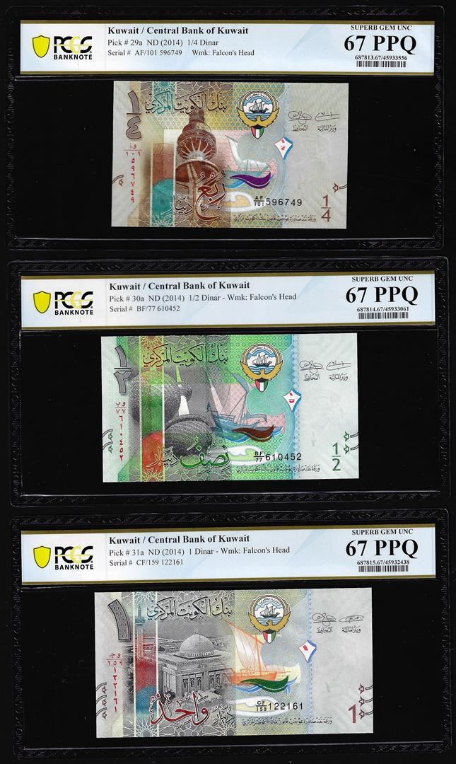 One Lot of 2014 Kuwait 1/4, 1/2 & 1 Dinar Notes PCGS Superb Gem Uncirculated 67PPQ. PCGS Graded.