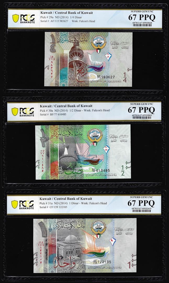 One Lot of 2014 Kuwait 1/4, 1/2 & 1 Dinar Notes PCGS Superb Gem Uncirculated 67PPQ. PCGS Graded.