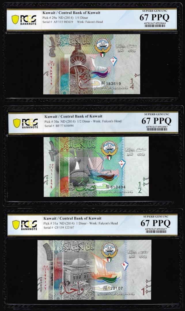 One Lot of 2014 Kuwait 1/4, 1/2 & 1 Dinar Notes PCGS Superb Gem Uncirculated 67PPQ. PCGS Graded.