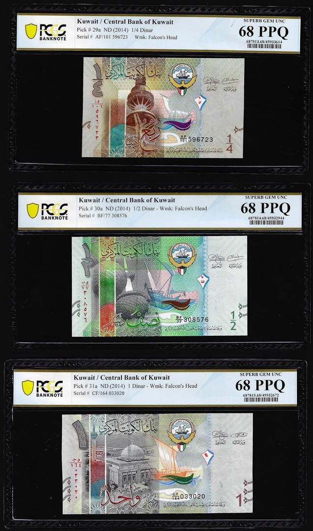 One Lot of 2014 Kuwait 1/4, 1/2 & 1 Dinar Notes PCGS Superb Gem Uncirculated 68PPQ. PCGS Graded.