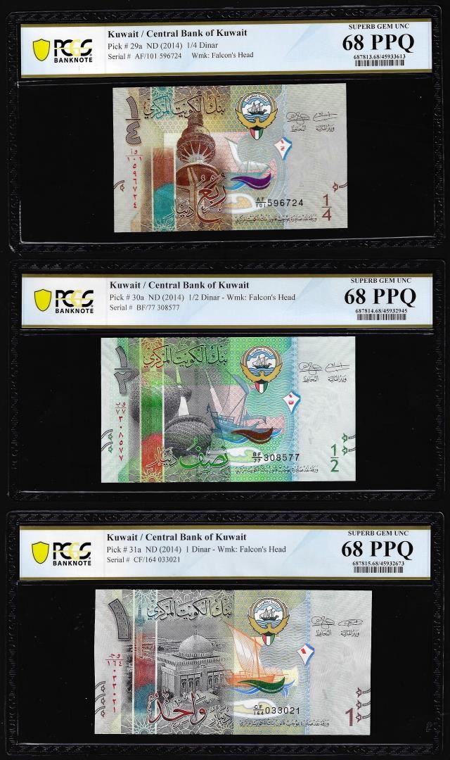 One Lot of 2014 Kuwait 1/4, 1/2 & 1 Dinar Notes PCGS Superb Gem Uncirculated 68PPQ. PCGS Graded.