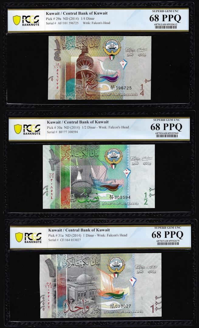 One Lot of 2014 Kuwait 1/4, 1/2 & 1 Dinar Notes PCGS Superb Gem Uncirculated 68PPQ. PCGS Graded.