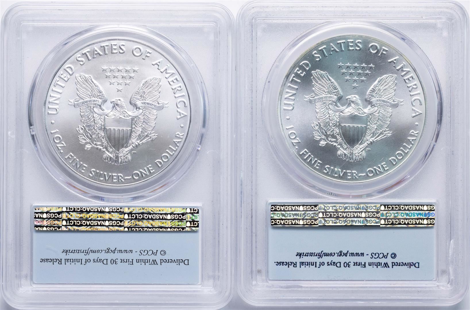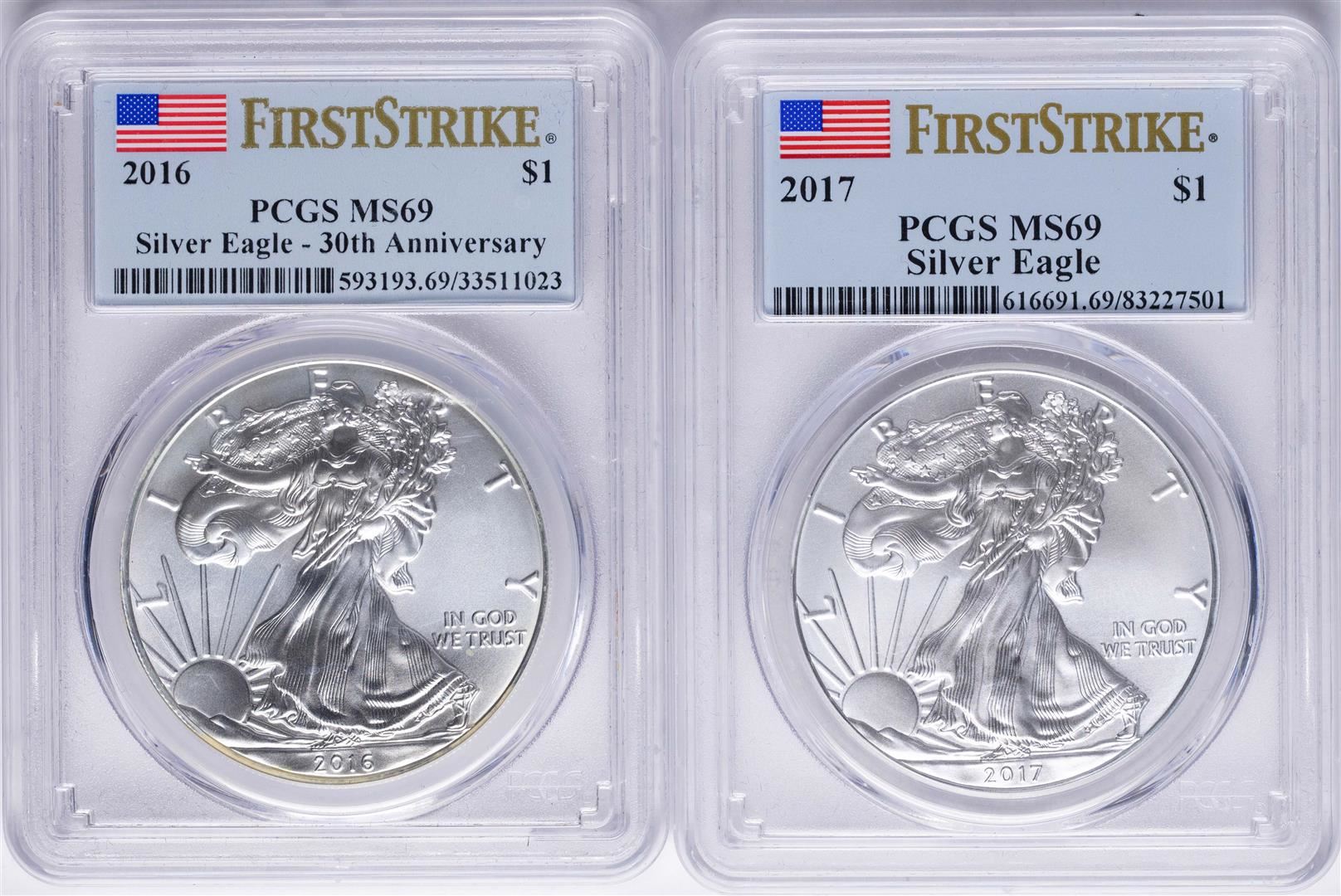 One Lot of 2016-2017 $1 American Silver Eagle Coins PCGS MS69 First Strikes. PCGS Graded.