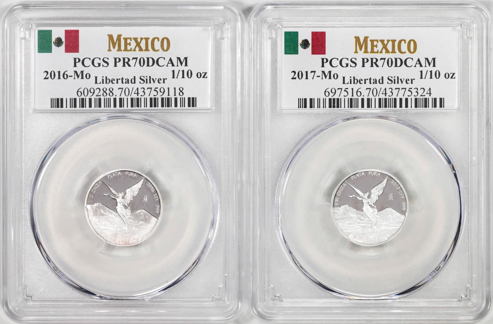 One Lot of 2016-2017-Mo Mexico Proof 1/10 oz Silver Libertad Coins PCGS PR70DCAM. PCGS Graded.