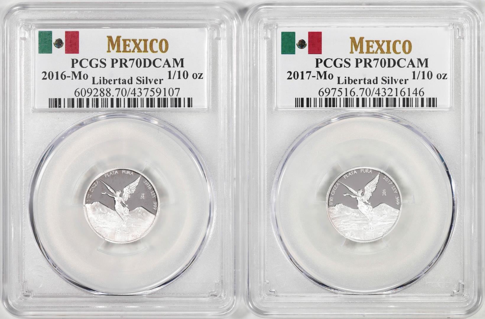 One Lot of 2016-2017-Mo Mexico Proof 1/10 oz Silver Libertad Coins PCGS PR70DCAM. PCGS Graded.