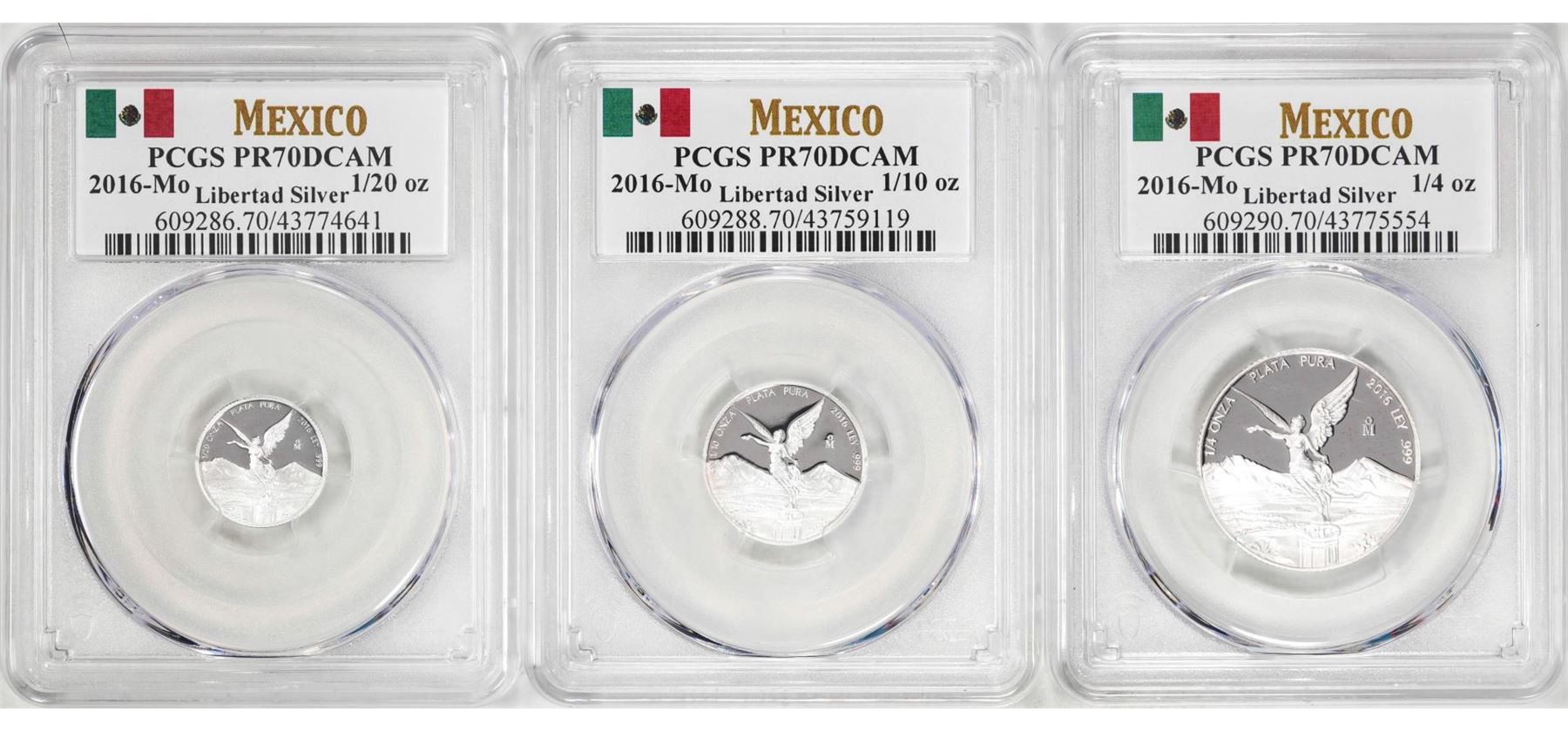 One Lot of 2016-Mo Mexico Proof 1/20, 1/10 and 1/4 oz Silver Libertad Coins PCGS PR69DCAM. PCGS Graded.