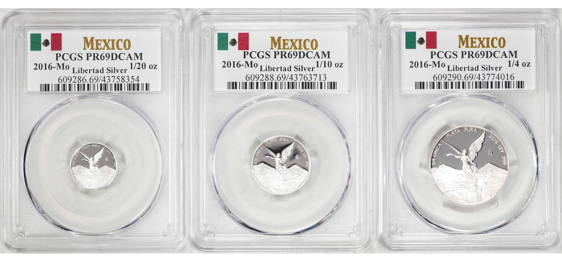 Lot of 2016-Mo Mexico Proof 1/20, 1/10 and 1/4 oz Silver Libertad Coins PCGS PR69DCAM
