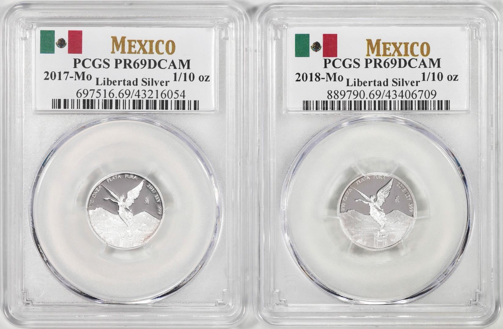 One Lot of 2017-2018-Mo Mexico Proof 1/10 oz Silver Libertad Coins PCGS PR69DCAM. PCGS Graded.