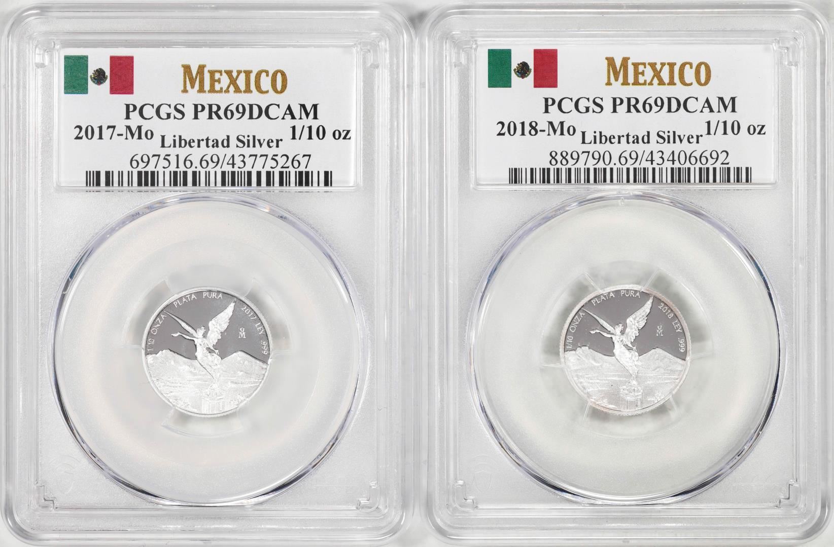 One Lot of 2017-2018-Mo Mexico Proof 1/10 oz Silver Libertad Coins PCGS PR69DCAM. PCGS Graded.